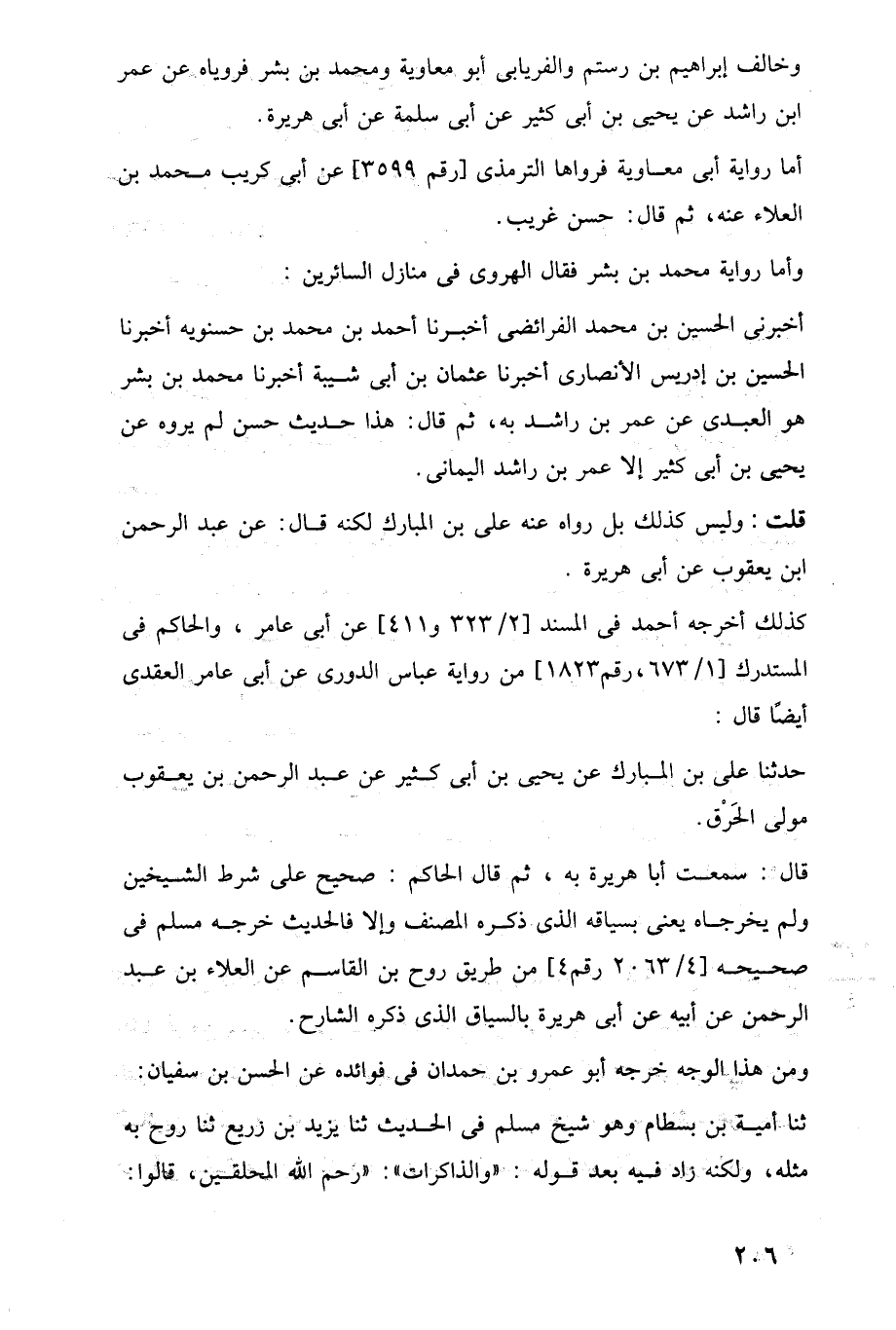 وخالف إبراهيم بن رستم والفريابى أبو معاوية ومحمد بن بشر فروياه عن عمر ابن راشد عن يحيى بن أبي كثير عن أبي سلمة عن أبي هريرة.