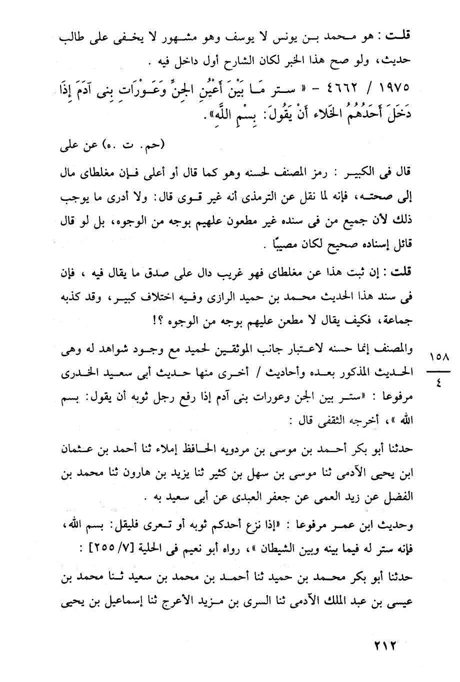 1975/ 4662 - "ستر مَا بَيْنَ أَعْيُنِ الجِنِّ وَعَوْرَاتِ بنِى آدَمَ إِذَا دَخَلَ أَحَدُهُمُ الخَلاء أَنْ يَقُولَ: بِسْمِ اللَّهِ".