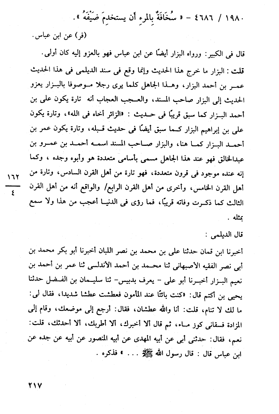 قلت: البزار ما خرج هذا الحديث وإنما وقع في سند الديلمى في هذا الحديث عمر بن أحمد البزار، وهذا الجاهل كلما يرى رجلا موصوفا بالبزار يعزو الحديث إلى البزار صاحب المسند، والعجب العجاب أنه تارة يكون على بن أحمد البزار كما سبق قريبًا في حديث: "الزائر أخاه في اللَّه"، وتارة يكون على بن إبراهيم البزار كما سبق أيضًا في حديث قبله، وتارة يكون عمر بن أحمد البزار كما هنا، والبزار صاحب المسند اسمه أحمد بن عمرو بن عبد الخالق فهو عند هذا الجاهل مسمى باسامى متعددة هو وأبوه وجده، وكما إنه عنده موجود في قرون متعددة، فهو تارة من أهل القرن السادس، وتارة من أهل القرن الخامس، وأخرى من أهل القرن الرابع والواقع أنه من أهل القرن الثالث كما ذكرت وفاته قريبًا، فما رؤى في الدنيا أعجب من هذا ولا سمع بمثله.