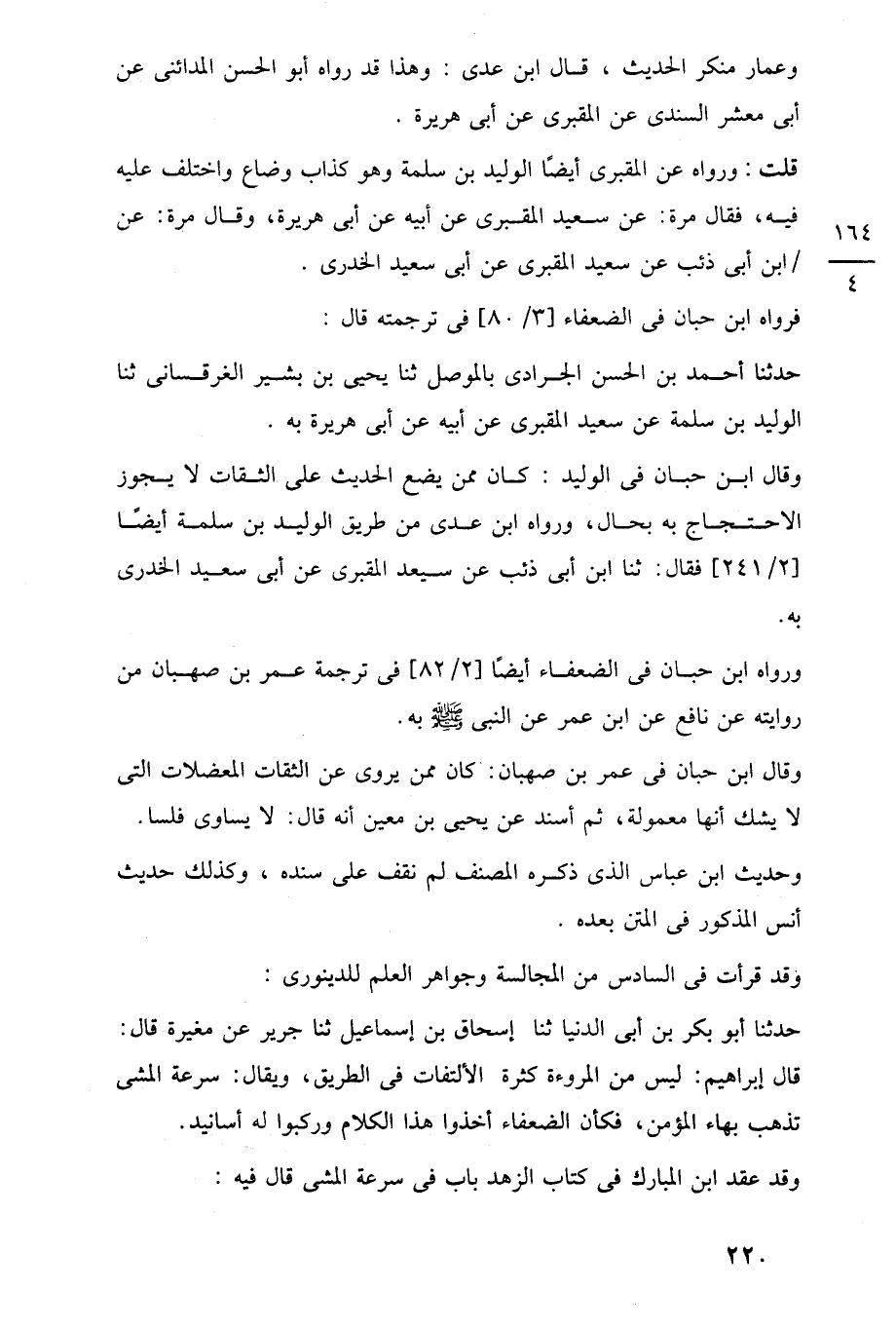 حدثنا أبو بكر بن أبي الدنيا ثنا إسحاق بن إسماعيل ثنا جرير عن مغيرة قال: قال إبراهيم: ليس من المروءة كثرة الألتفات في الطريق، ويقال: سرعة المشى تذهب بهاء المؤمن، فكأن الضعفاء أخذوا هذا الكلام وركبوا له أسانيد.