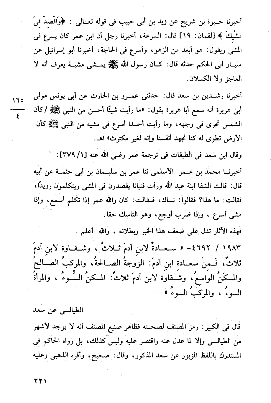 أخبرنا حيوة بن شريح عن زيد بن أبي حبيب في قوله تعالى: {وَاقْصِدْ فِي مَشْيِكَ} [لقمان: 19] قال: السرعة، أخبرنا رجل أن ابن عمر كان يسرع في المشى ويقول: هو أبعد من الزهو، وأسرع في الحاجة، أخبرنا أبو إسرائيل عن سيار أبي الحكم حدثه قال: كان رسول اللَّه -صلى اللَّه عليه وسلم- يمشى مشية يعرف أن العاجز ولا الكسلان.
