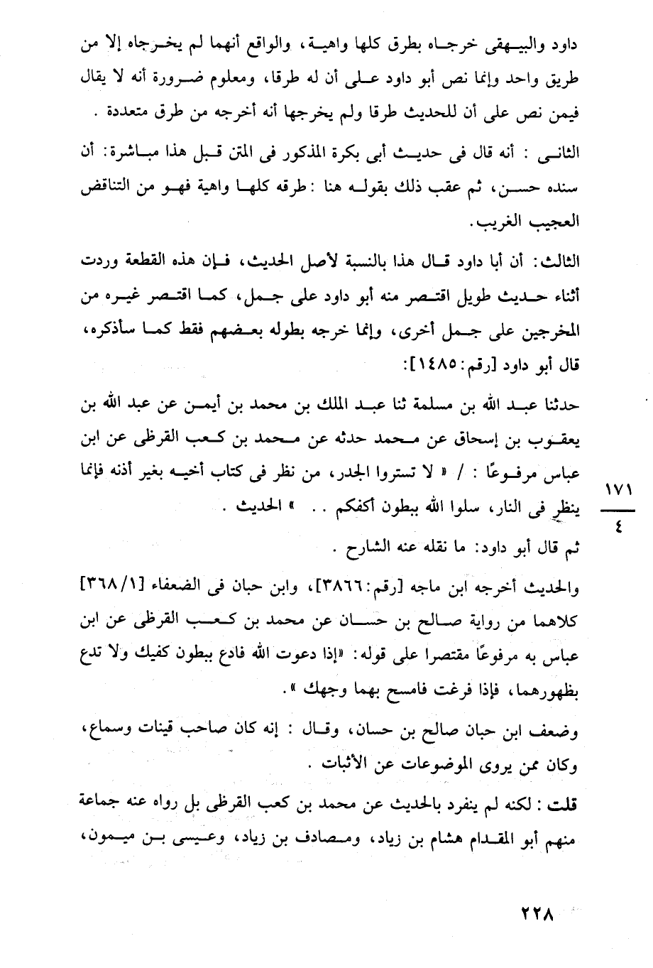 الثالث: أن أبا داود قال هذا بالنسبة لأصل الحديث، فإن هذه القطعة وردت أثناء حديث طويل اقتصر منه أبو داود على جمل، كما اقتصر غيره من المخرجين على جمل أخرى، وإنما خرجه بطوله بعضهم فقط كما سأذكره، قال أبو داود [رقم: 1485]: