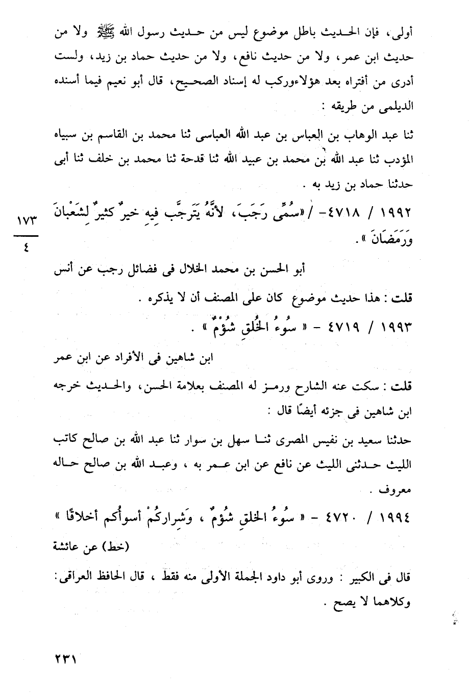 أولى، فإن الحديث باطل موضوع ليس من حديث رسول اللَّه -صلى اللَّه عليه وسلم- ولا من حديث ابن عمر، ولا من حديث نافع، ولا من حديث حماد بن زيد، ولست أدرى من أفتراه بعد هؤلاء وركب له إسناد الصحيح، قال أبو نعيم فيما أسنده الديلمى من طريقه: