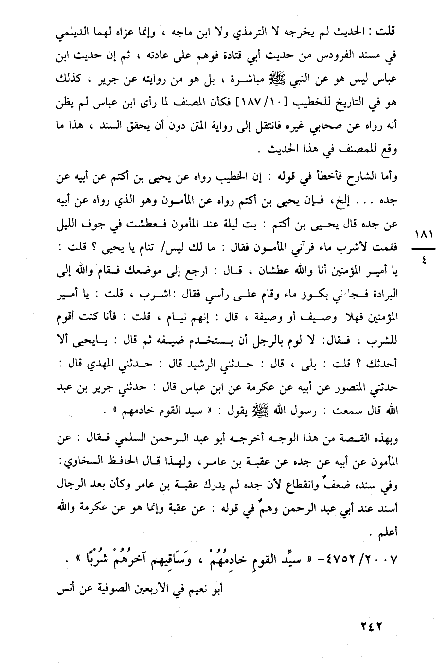 وأما الشارح فأخطأ في قوله: إن الخطيب رواه عن يحيى بن أكتم عن أبيه عن جده. . . إلخ، فإن يحيى بن أكتم رواه عن المأمون وهو الذي رواه عن أبيه عن جده قال يحيى بن أكتم: بت ليلة عند المأمون فعطشت في جوف الليل فقمت لأشرب ماء فرآني المأمون فقال: ما لك ليس تنام يا يحيى؟ قلت: يا أمير المؤمنين أنا واللَّه عطشان، قال: ارجع إلى موضعك فقام واللَّه إلى البرادة فجاءني بكوز ماء وقام على رأسي فقال: اشرب، قلت: يا أمير المؤمنين فهلا وصيف أو وصيفة، قال: إنهم نيام، قلت: فأنا كنت أقوم للشرب، فقال: لا لوم بالرجل أن يستخدم ضيفه ثم قال: يا يحيى ألا أحدثك؟ قلت: بلى، قال: حدثنى الرشيد قال: حدثنى المهدي قال: حدثنى المنصور عن أبيه عن عكرمة عن ابن عباس قال: حدثنى جرير بن عبد اللَّه قال سمعت: رسول اللَّه -صلى اللَّه عليه وسلم- يقول: "سيد القوم خادمهم".