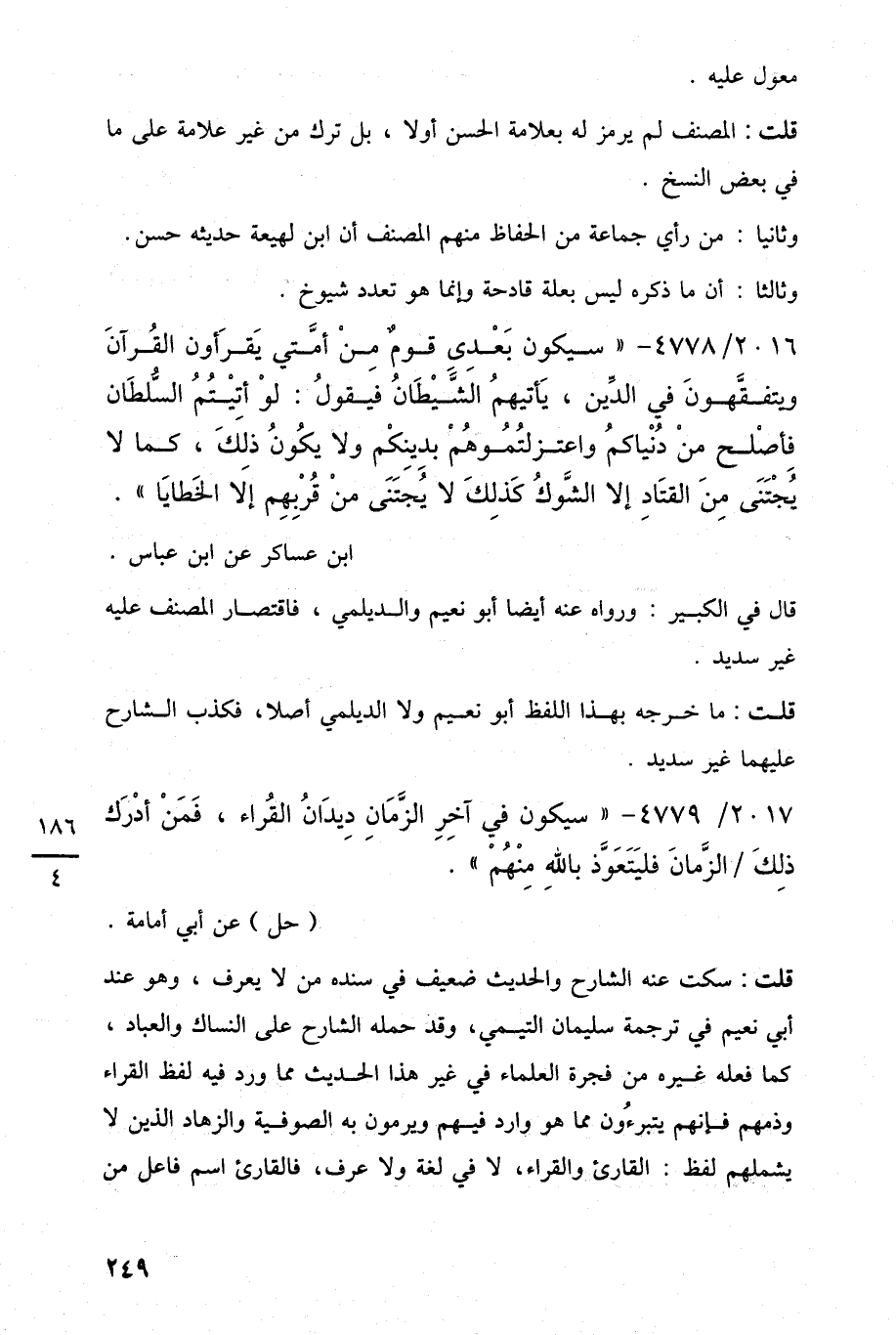 قلت: سكت عنه الشارح والحديث ضعيف في سنده من لا يعرف، وهو عند أبي نعيم في ترجمة سليمان التيمى، وقد حمله الشارح على النساك والعباد، كما فعله غيره من فجرة العلماء في غير هذا الحديث مما ورد فيه لفظ القراء وذمهم فإنهم يتبرءُون مما هو وارد فيهم ويرمون به الصوفية والزهاد الذين لا يشملهم لفظ: القارئ والقراء، لا في لغة ولا عرف، فالقارئ اسم فاعل من