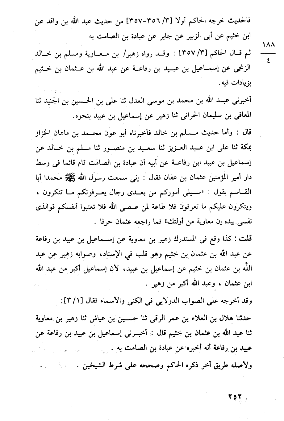 قال: وأما حديث مسلم بن خالد فأخبرناه أبو عون محمد بن ماهان الخزاز بمكة ثنا على ابن عبد العزيز ثنا سعيد بن منصور ثنا مسلم بن خالد عن إسماعيل بن عبيد ابن رفاعة عن أبيه أن عبادة بن الصامت قام قائما في وسط دار أمير المؤمنين عثمان بن عفان فقال: إنى سمعت رسول اللَّه -صلى اللَّه عليه وسلم- محمدا أبا القاسم يقول: "سيلى أموركم من بعدى رجال يعرفونكم ما تنكرون، وينكرون عليكم ما تعرفون فلا طاعة لمن عصى اللَّه فلا تعتبوا أنفسكم فوالذى نفسى بيده إن معاوية من أولئك" فما راجعه عثمان حرفا.