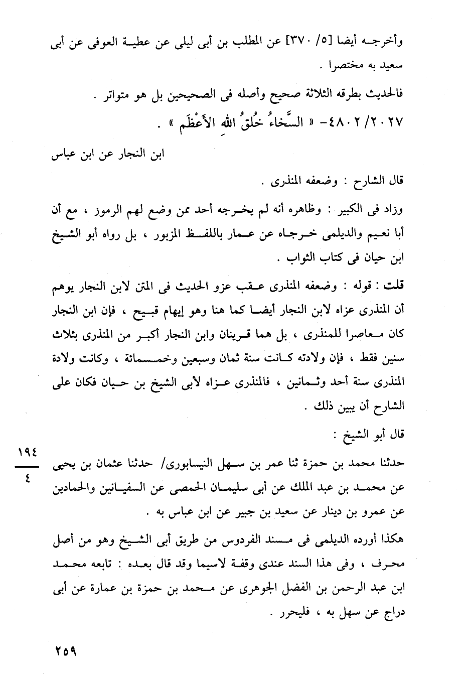 قلت: قوله: وضعفه المنذرى عقب عزو الحديث في المتن لابن النجار يوهم أن المنذرى عزاه لابن النجار أيضًا كما هنا وهو إيهام قبيح، فإن ابن النجار كان معاصرا للمنذرى، بل هما قرينان وابن النجار أكبر من المنذرى بثلاث سنين فقط، فإن ولادته كانت سنة ثمان وسبعين وخمسمائة، وكانت ولادة المنذرى سنة أحد وثمانين، فالمنذرى عزاه لأبي الشيخ بن حيان فكان على الشارح أن يبين ذلك.