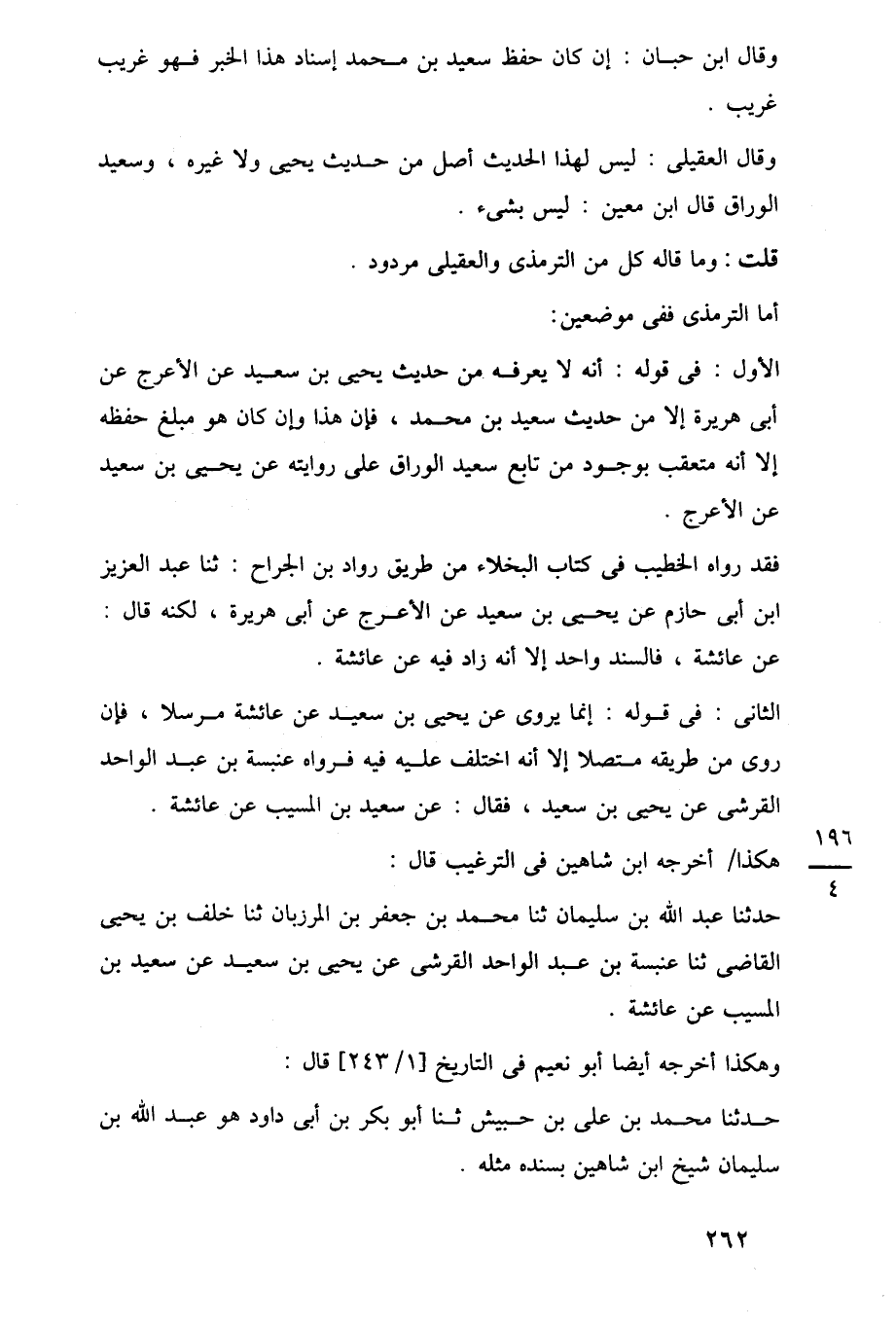 الأول: في قوله: أنه لا يعرفه من حديث يحيى بن سعيد عن الأعرج عن أبي هريرة إلا من حديث سعيد بن محمد، فإن هذا وإن كان هو مبلغ حفظه إلا أنه متعقب بوجود من تابع سعيد الوراق على روايته عن يحيى بن سعيد عن الأعرج.