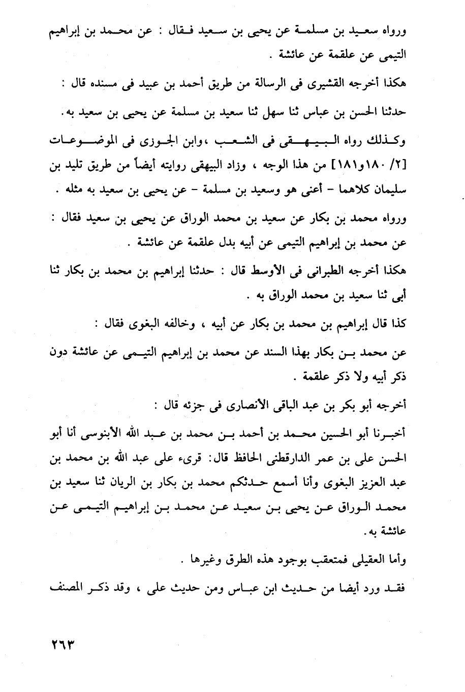 أخبرنا أبو الحسين محمد بن أحمد بن محمد بن عبد اللَّه الأبنوسى أنا أبو الحسن على بن عمر الدارقطنى الحافظ قال: قرئ على عبد اللَّه بن محمد بن عبد العزيز البغوى وأنا أسمع حدثكم محمد بن بكار بن الريان ثنا سعيد بن محمد الوراق عن يحيى بن سعيد عن محمد بن إبراهيم التيمى عن عائشة به.