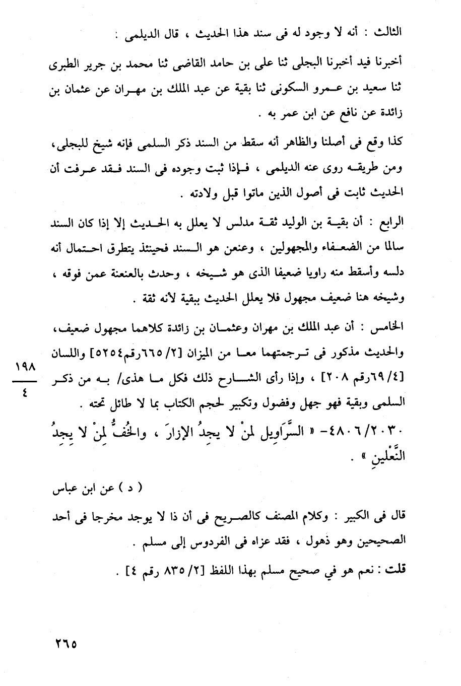الرابع: أن بقية بن الوليد ثقة مدلس لا يعلل به الحديث إلا إذا كان السند سالما من الضعفاء والمجهولين، وعنعن هو السند فحينئذ يتطرق احتمال أنه دلسه وأسقط منه راويا ضعيفًا الذي هو شيخه، وحدث بالعنعنة عمن فوقه، وشيخه هنا ضعيف مجهول فلا يعلل الحديث ببقية لأنه ثقة.