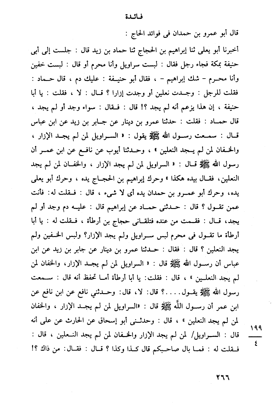 أخبرنا أبو يعلى ثنا إبراهيم بن الحجاج ثنا حماد بن زيد قال: جلست إلى أبي حنيفة بمكة فجاء رجل فقال: لبست سراويل وأنا محرم أو قال: لبست خفين وأنا محرم -شك إبراهيم-، فقال أبو حنيفة: عليك دم، قال حماد: فقلت للرجل: وجدت نعلين أو وجدت إزارا؟ قال: لا، فقلت: يا أبا حنيفة، إن هذا يزعم أنه لم يجد؟! قال: فقال: سواء وجد أو لم يجد، قال حماد: فقلت: حدثنا عمرو بن دينار عن جابر بن زيد عن ابن عباس قال: سمعت رسول اللَّه -صلى اللَّه عليه وسلم- يقول: "السراويل لمن لم يجد الإزار، والخفان لمن لم يجد النعلين"، وحدثنا أيوب عن نافع عن ابن عمر أن رسول اللَّه -صلى اللَّه عليه وسلم- قال: "السراويل لمن لم يجد الإزار، والخفان لمن لم يجد النعلين، فقال بيده هكذا" وحرك إبراهيم بن الحجاج يده، وحرك أبو يعلى يده، وحرك أبو عمرو بن حمدان يده أى لا شيء، قال: فقلت له: فأنت عمن تقول؟ قال: حدثنى حماد عن إبراهيم قال: عليه دم وجد أو لم يجد، قال: فقمت من عنده فتلقانى حجاج بن أرطأة، فقلت له: يا أبا أرطأة ما تقول في محرم لبس سراويل ولم يجد الإزار؟ ولبس الخفين ولم يجد النعلين؟ قال: فقال: حدثنا عمرو بن دينار عن جابر بن زيد عن ابن عباس أن رسول اللَّه -صلى اللَّه عليه وسلم- قال: "السراويل لمن لم يجد الإزار، والخفان لمن لم يجد النعلين"، قال: فقلت: يا أبا أرطأة أما تحفظ أنه قال: سمعت رسول اللَّه -صلى اللَّه عليه وسلم- يقول. . .؟ قال: لا، قال: وحدثني نافع عن ابن نافع عن ابن عمر أن رسول اللَّه -صلى اللَّه عليه وسلم- قال: "السراويل لمن لم يجد الإزار، والخفان لمن لم يجد النعلين"، قال: وحدثنى أبو إسحاق عن الحارث عن على أنه قال: السراويل لمن لم يجد الإزار والخفان لمن لم يجد النعلين، قال: فقلت له: فما بال صاحبكم قال كذا وكذا؟ قال: فقال: من ذاك؟!