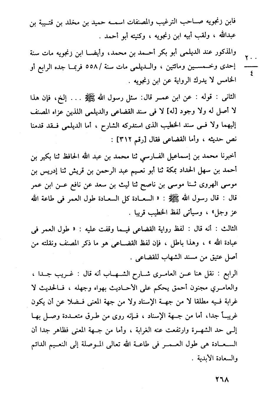 الثالث: أنه قال: لفظ رواية القضاعى فيما وقفت عليه: "طول العمر في عبادة اللَّه"، وهذا باطل، فإن لفظ القضاعى هو ما ذكر المصنف ونقلته من أصل عتيق من مسند الشهاب للقضاعى.