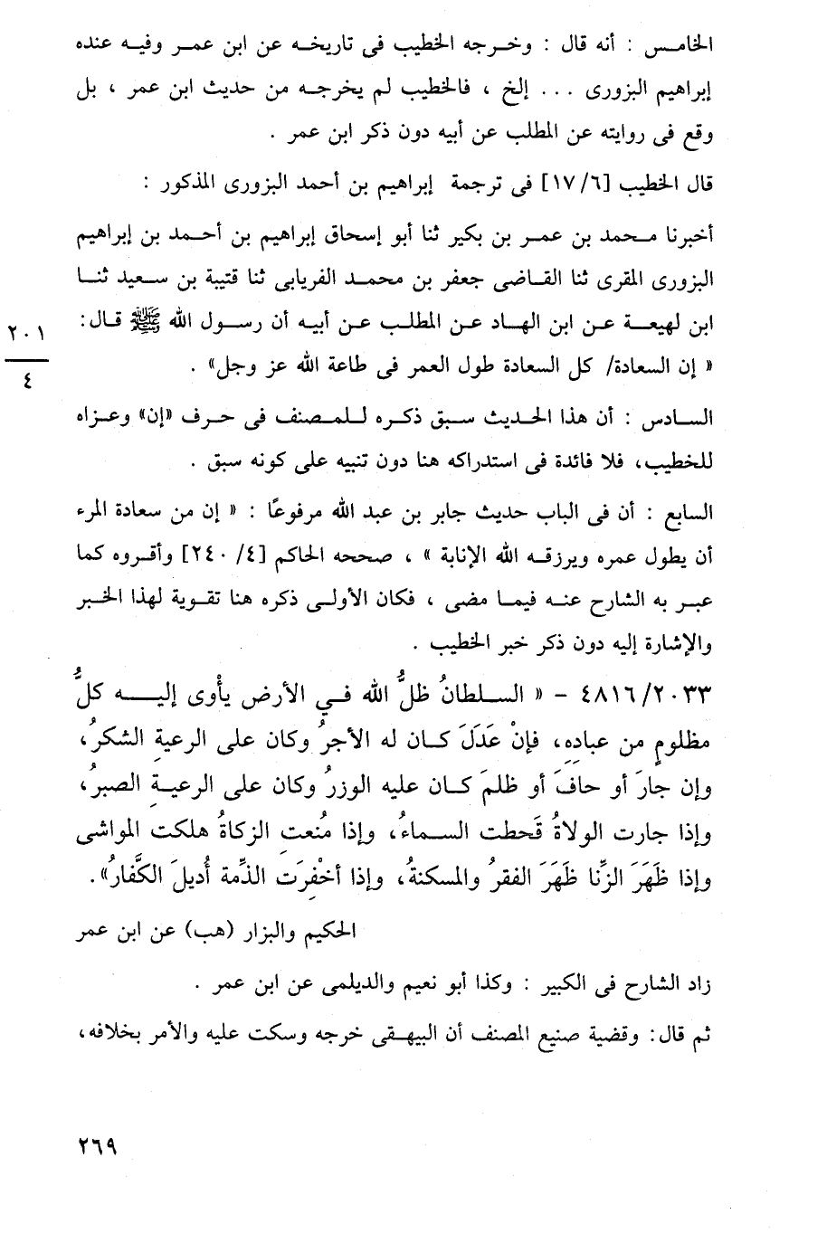 2033/ 4816 - "السلطانُ ظلُّ اللَّه في الأرض يأْوى إليه كلُّ مظلومٍ من عبادِهِ، فإنْ عَدَلَ كان له الأجرُ وكان على الرعية الشكرُ، وإن جارَ أو حافَ أو ظلمَ كان عليه الوزرُ وكان على الرعيةَ الصبرُ، وإذا جارت الولاةُ قَحطت السماءُ، وإذا مُنعتِ الزكاةُ هلكتَ المواشي وإذا ظَهَرَ الزِّنا ظَهَرَ الفقرُ والمسكنةُ، وإذا أخْفِرَت الذِّمة أُديلَ الكَّفارُ".