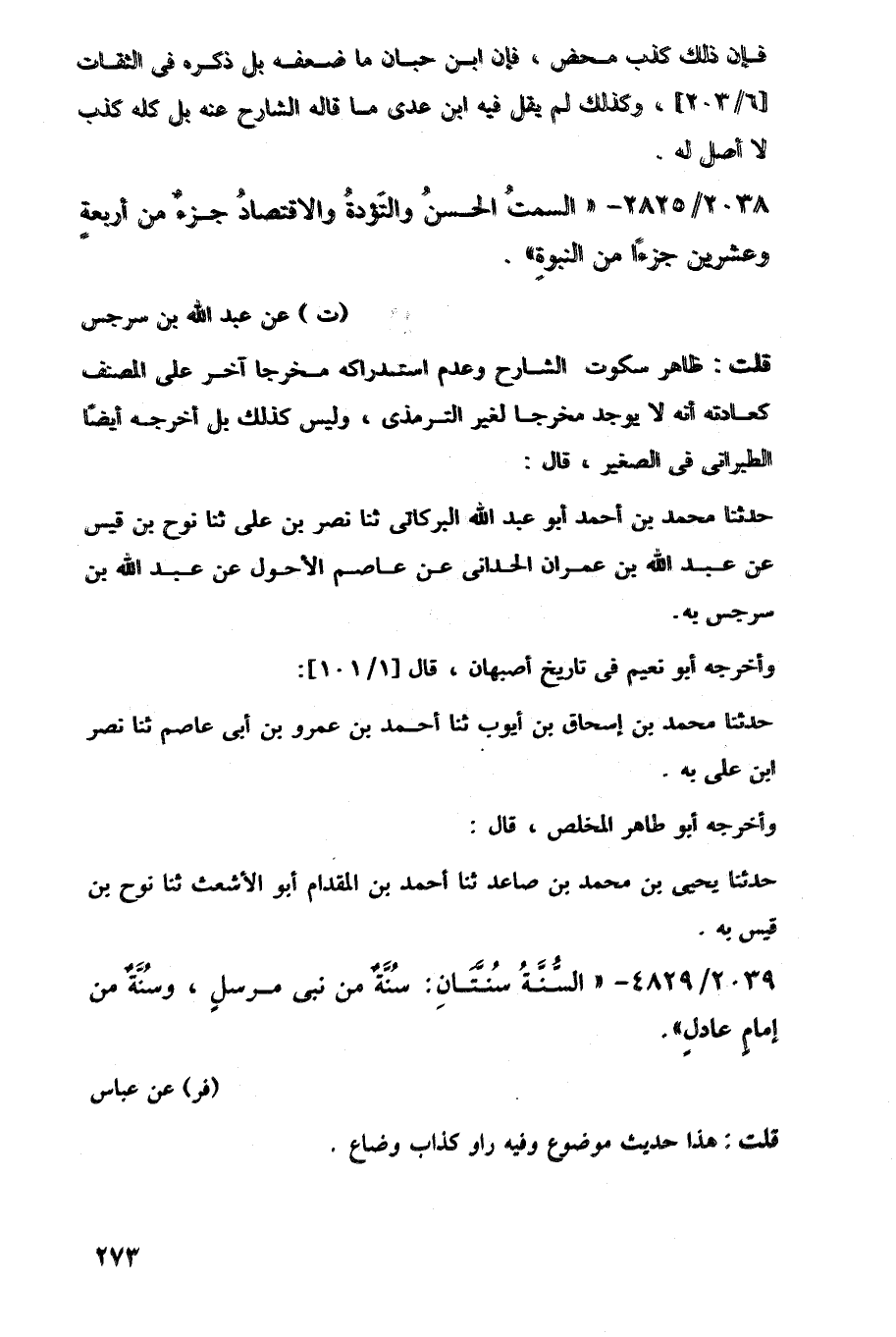 فإن ذلك كذب محض، فإن ابن حبان ما ضعفه بل ذكره في الثقات [6/ 203]، وكذلك لم يقل فيه ابن عدى ما قاله الشارح عنه بل كله كذب لا أصل له.