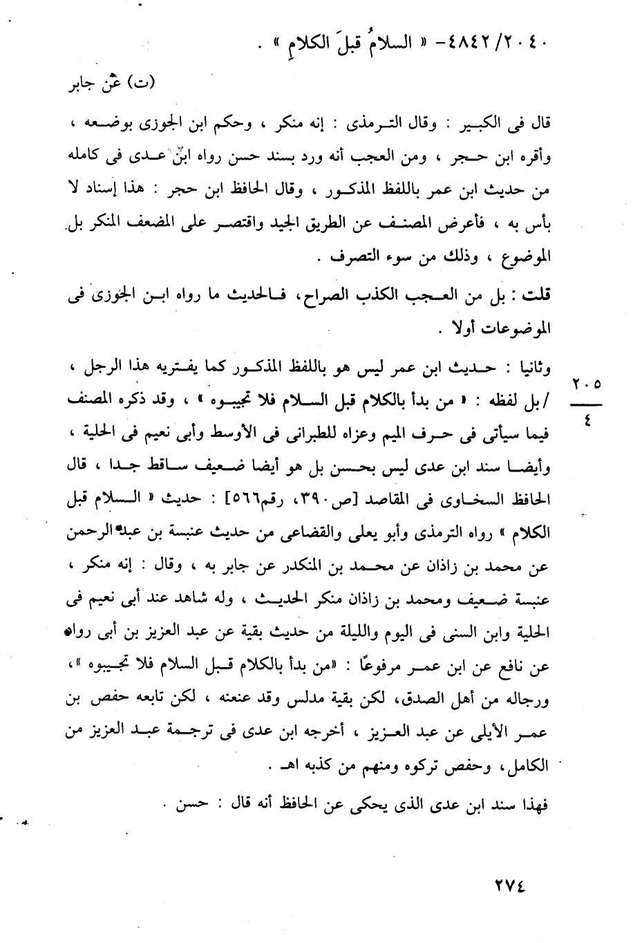 وثانيا: حديث ابن عمر ليس هو باللفظ المذكور كما يفتريه هذا الرجل، بل لفظه: "من بدأ بالكلام قبل السلام فلا تجيبوه"، وقد ذكره المصنف فيما سيأتى في حرف الميم وعزاه للطبرانى في الأوسط وأبي نعيم في الحلية، وأيضًا سند ابن عدى ليس بحسن بل هو أيضًا ضعيف ساقط جدًا، قال الحافظ السخاوى في المقاصد [ص 390، رقم 566]: حديث "السلام قبل الكلام" رواه الترمذى وأبو يعلى والقضاعى من حديث عنبسة بن عبد الرحمن عن محمد بن زاذان عن محمد بن المنكدر عن جابر به، وقال: إنه منكر، عنبسة ضعيف ومحمد بن زاذان منكر الحديث، وله شاهد عند أبي نعيم في الحلية وابن السنى في اليوم والليلة من حديث بقية عن عبد العزيز بن أبي رواه عن نافع عن ابن عمر مرفوعًا: "من بدأ بالكلام قبل السلام فلا تجيبوه"، ورجاله من أهل الصدق، لكن بقية مدلس وقد عنعنه، لكن تابعه حفص بن عمر الأيلى عن عبد العزيز، أخرجه ابن عدى في ترجمة عبد العزيز من الكامل، وحفص تركوه ومنهم من كذبه اهـ.