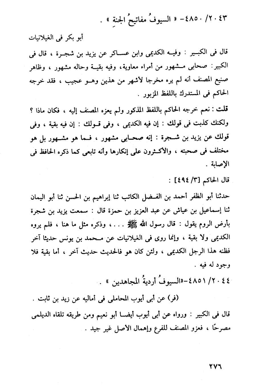 حدثنا أبو الظفر أحمد بن الفضل الكاتب ثنا إبراهيم بن الحسن ثنا أبو اليمان ثنا إسماعيل بن عياش عن عبد العزيز بن حمزة قال: سمعت يزيد بن شجرة بأرض الروم يقول: قال رسول اللَّه -صلى اللَّه عليه وسلم-. . .، وذكره مثل ما هنا، فلم يروه الكديمى ولا بقية، وإنما روى في الغيلانيات عن محمد بن يونس حديثًا آخر فظنه هذا الرجل الكديمى، ولئن كان هو فالحديث حديث آخر، أما بقية فلا وجود له فيه.