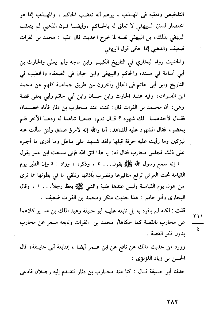 التلخيص وتعقبه في المهذب، يوهم أنه تعقب الحاكم، والمهذب إنما هو اختصار لسنن البيهقى لا تعلق له بالحاكم، وأيضًا فإن الذهبى لم يتعقب البيهقى بذلك، بل البيهقى نفسه لما خرج الحديث قال عقبه: محمد بن الفرات ضعيف والذهبي إنما حكى قول البيهقى.