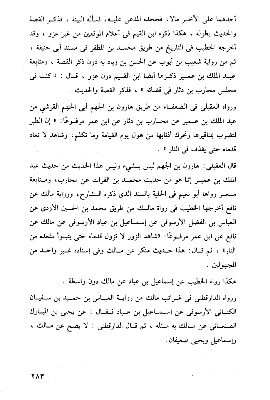 قال العقيلى: هارون بن الجهم ليس بشيء وليس هذا الحديث من حديث عبد الملك بن عمير إنما هو من حديث محمد بن الفرات عن محارب، ومتابعة مسعر رواها أبو نعيم في الحلية بالسند الذي ذكره الشارح، ورواية مالك عن نافع أخرجها الخطيب في رواة مالك من طريق محمد بن الحسين الأزدى عن العباس بن الفضل الأرسوفى عن إسماعيل بن عباد الأرسوفى عن مالك عن نافع عن ابن عمر مرفوعًا: "شاهد الزور لا تزول قدماه حتى يتبوأ مقعده من النار"، ثم قال: هذا حديث منكر عن مالك وفي إسناده غير واحد من المجهولين.