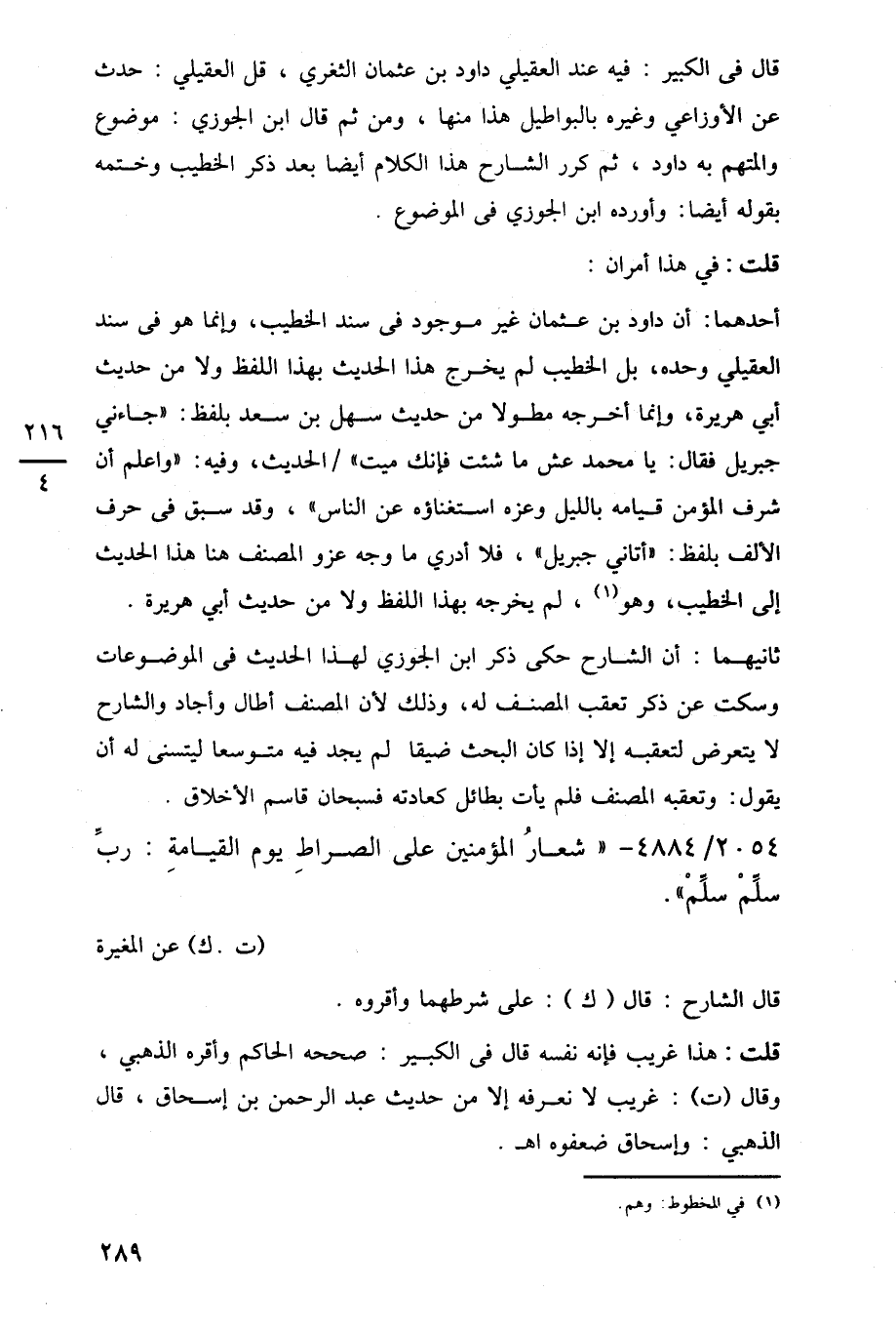 ثانيهما: أن الشارح حكى ذكر ابن الجوزى لهذا الحديث في الموضوعات وسكت عن ذكر تعقب المصنف له، وذلك لأن المصنف أطال وأجاد والشارح لا يتعرض لتعقبه إلا إذا كان البحث ضيقا لم يجد فيه متوسعا ليتسنى له أن يقول: وتعقبه المصنف فلم يأت بطائل كعادته فسبحان قاسم الأخلاق.
