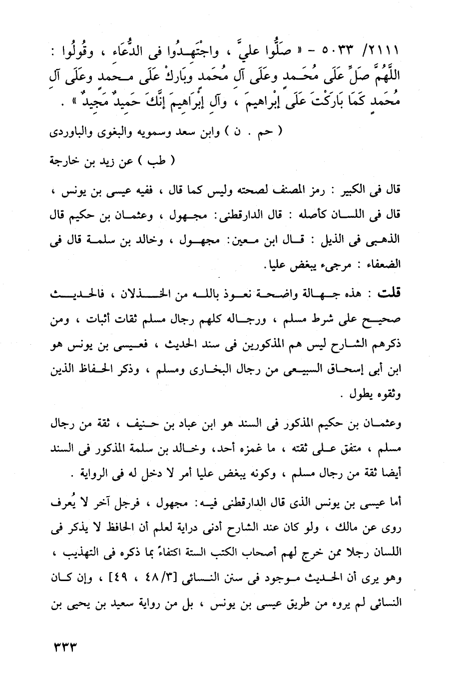 أما عيسى بن يونس الذي قال الدارقطنى فيه: مجهول، فرجل آخر لا يُعرف روى عن مالك، ولو كان عند الشارح أدنى دراية لعلم أن الحافظ لا يذكر في اللسان رجلا ممن خرج لهم أصحاب الكتب الستة اكتفاءً بما ذكره في التهذيب، وهو يرى أن الحديث موجود في سنن النسائى [3/ 48، 49]، وإن كان النسائى لم يروه من طريق عيسى بن يونس، بل من رواية سعيد بن يحيى بن