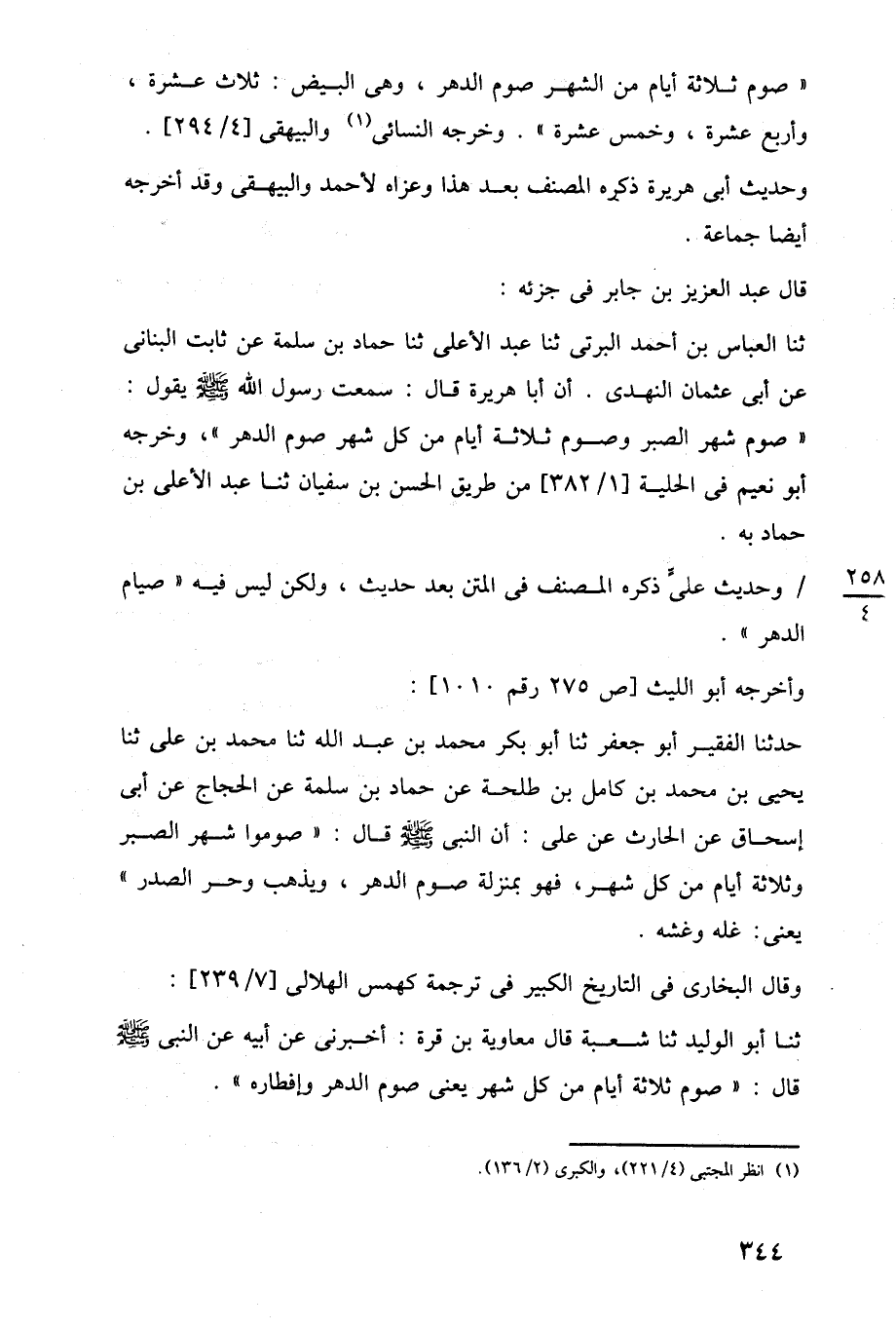 ثنا العباس بن أحمد البرتى ثنا عبد الأعلى ثنا حماد بن سلمة عن ثابت البنانى عن أبي عثمان النهدى. أن أبا هريرة قال: سمعت رسول اللَّه -صلى اللَّه عليه وسلم- يقول: "صوم شهر الصبر وصوم ثلاثة أيام من كل شهر صوم الدهر"، وخرجه أبو نعيم في الحلية [1/ 382] من طريق الحسن بن سفيان ثنا عبد الأعلى بن حماد به.