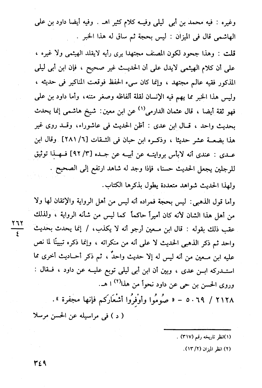 قلت: وهذا جحود لكون المصنف مجتهدا يرى رأيه لا يقلد الهيثمى ولا غيره، على أن كلام الهيثمى لا يدل على أن الحديث غير صحيح، فإن ابن أبي ليلى المذكور فقيه عالم مجتهد، وإنما كان سئ الحفظ فوقعت المناكير في حديثه، وليس هذا الخبر مما يهم فيه الإنسان لقلة ألفاظه وصغر متنه، وأما داود بن على فهو ثقة أيضًا، قال عثمان الدارمى (¬1) عن ابن معين: شيخ هاشمى إنما يحدث بحديث واحد، قال ابن عدى: أظن الحديث في عاشوراء، وقد روى غير هذا بضعة عشر حديثا، وذكره ابن حبان في الثقات [6/ 281] وقال ابن عدى: عندى أنه لا بأس بروايته عن أبيه عن جده [3/ 92] فهذا توثيق للرجلين يجعل الحديث حسنا، فإذا وجد له شاهد ارتفع إلى الصحيح.