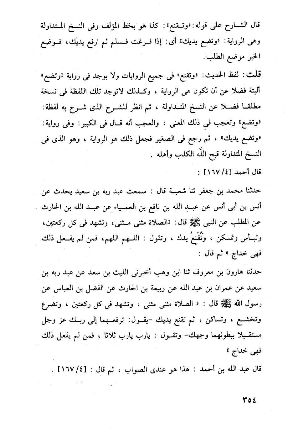 قلت: لفظ الحديث: "وتقنع" في جميع الروايات ولا يوجد في رواية "وتضع" ألبتة فضلا عن أن تكون هي الرواية، وكذلك لا توجد تلك اللفظة في نسخة مطلقا فضلا عن النسخ المتداولة، ثم انظر للشرح الذي شرح به لفظة: "وتضع" وتعجب في ذلك المعنى، والعجب أنه قال في الكبير: وفي رواية: "وتضع يديك"، ثم رجع في الصغير فجعل ذلك هو الرواية، وهو الذي في النسخ المتداولة قبح اللَّه الكذب وأهله.