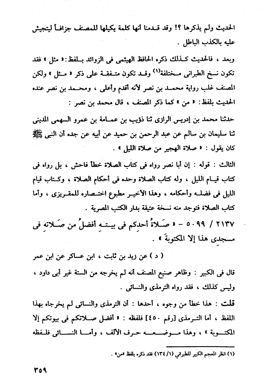 الثالث: قوله: إن أبا نصر رواه في كتاب الصلاة خطأ فاحش، بل رواه في كتاب قيام الليل، وله كتاب الصلاة وحده في أحكام الصلاة، وكتاب قيام الليل في فضله وأحكامه، وهذا الأخير مطبوع اختصاره للمقريزى، وأما كتاب الصلاة فتوجد منه نسخة عتيقة بدار الكتب المصرية.