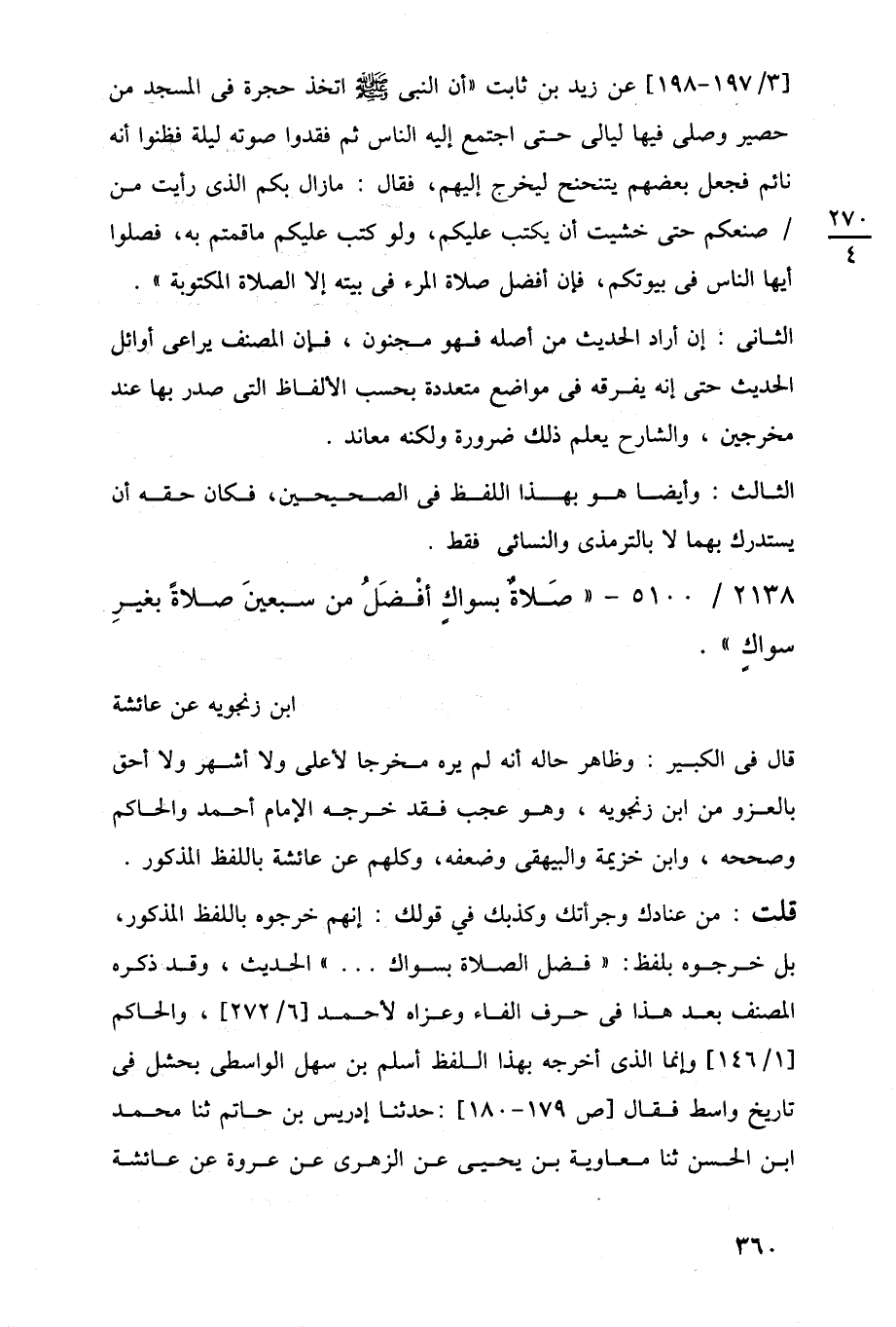 [3/ 197 - 198] عن زيد بن ثابت "أن النبي -صلى اللَّه عليه وسلم- اتخذ حجرة في المسجد من حصير وصلى فيها ليالى حتى اجتمع إليه الناس ثم فقدوا صوته ليلة فظنوا أنه نائم فجعل بعضهم يتنحنح ليخرج إليهم، فقال: ما زال بكم الذي رأيت من صنعكم حتى خشيت أن يكتب عليكم، ولو كتب عليكم ما قمتم به، فصلوا أيها الناس في بيوتكم، فإن أفضل صلاة المرء في بيته إلا الصلاة المكتوبة".