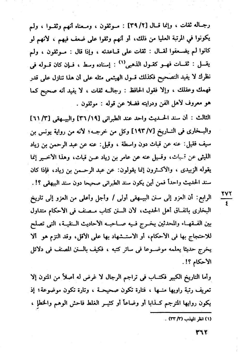 الرابع: أن العزو إلى سنن البيهقى أولى وأجل وأعلى من العزو إلى تاريخ البخارى باتفاق أهل الحديث، لأن السنن كتاب مصنف في الأحكام متداول بين الفقهاء والمحدثين يخرج فيه صاحبه الأحاديث النقية، التي تصلح للاحتجاج بها في الأحكام، أو الاستشهاد بها على الأقل، وقد التزم هو ألا يخرج حديثا يعلمه موضوعا في سائر كتبه، فكيف بالسنن المصنف في دلائل الأحكام؟!.