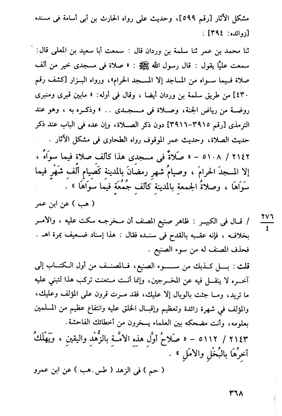 ثنا محمد بن عمر ثنا سلمة بن وردان قال: سمعت أبا سعيد بن المعلى قال: سمعت عليًا يقول: قال رسول اللَّه -صلى اللَّه عليه وسلم-: "صلاة في مسجدى خير من ألف صلاة فيما سواه من المساجد إلا المسجد الحرام"، ورواه البزار [كشف رقم 430] من طريق سلمة بن وردان أيضًا، وقال في أوله: "ما بين قبرى ومنبرى روضة من رياض الجنة، وصلاة في مسجدى. . " وذكره به، وهو عند الترمذى [رقم 3915 - 3916] دون ذكر الصلاة، وإن عده في الباب عند ذكر حديث الصلاة، وحديث عمر الموقوف رواه الطحاوى في مشكل الآثار.