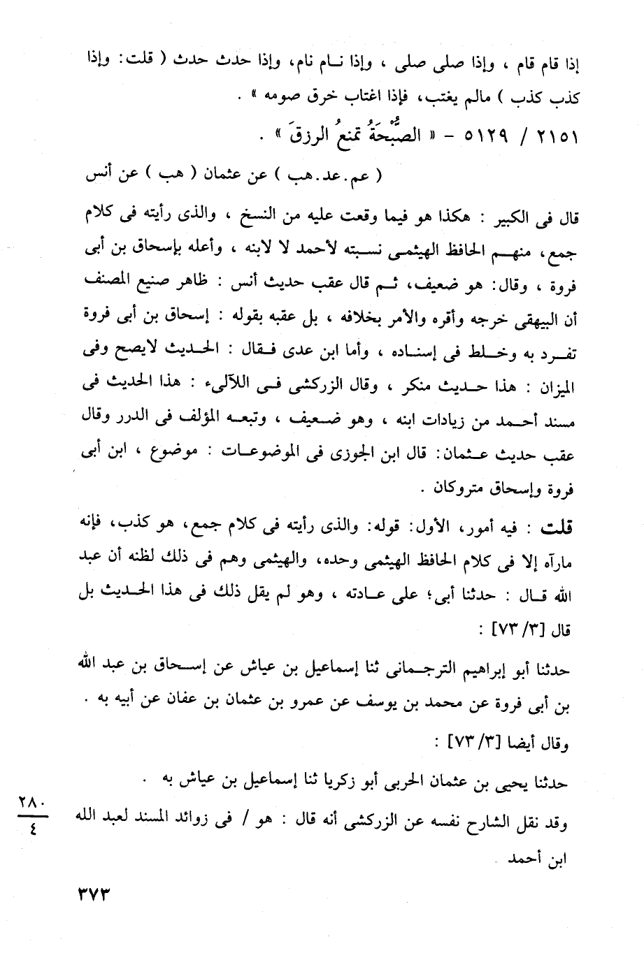 قال في الكبير: هكذا هو فيما وقعت عليه من النسخ، والذي رأيته في كلام جمع، منهم الحافظ الهيثمى نسبته لأحمد لا لابنه، وأعله بإسحاق بن أبي فروة، وقال: هو ضعيف، ثم قال عقب حديث أنس: ظاهر صنيع المصنف أن البيهقى خرجه وأقره والأمر بخلافه، بل عقبه بقوله: إسحاق بن أبي فروة تفرد به وخلط في إسناده، وأما ابن عدى فقال: الحديث لا يصح وفي الميزان: هذا حديث منكر، وقال الزركشى في اللآلئ: هذا الحديث في مسند أحمد من زيادات ابنه، وهو ضعيف، وتبعه المؤلف في الدرر وقال عقب حديث عثمان: قال ابن الجوزى في الموضوعات: موضوع، ابن أبي فروة وإسحاق متروكان.