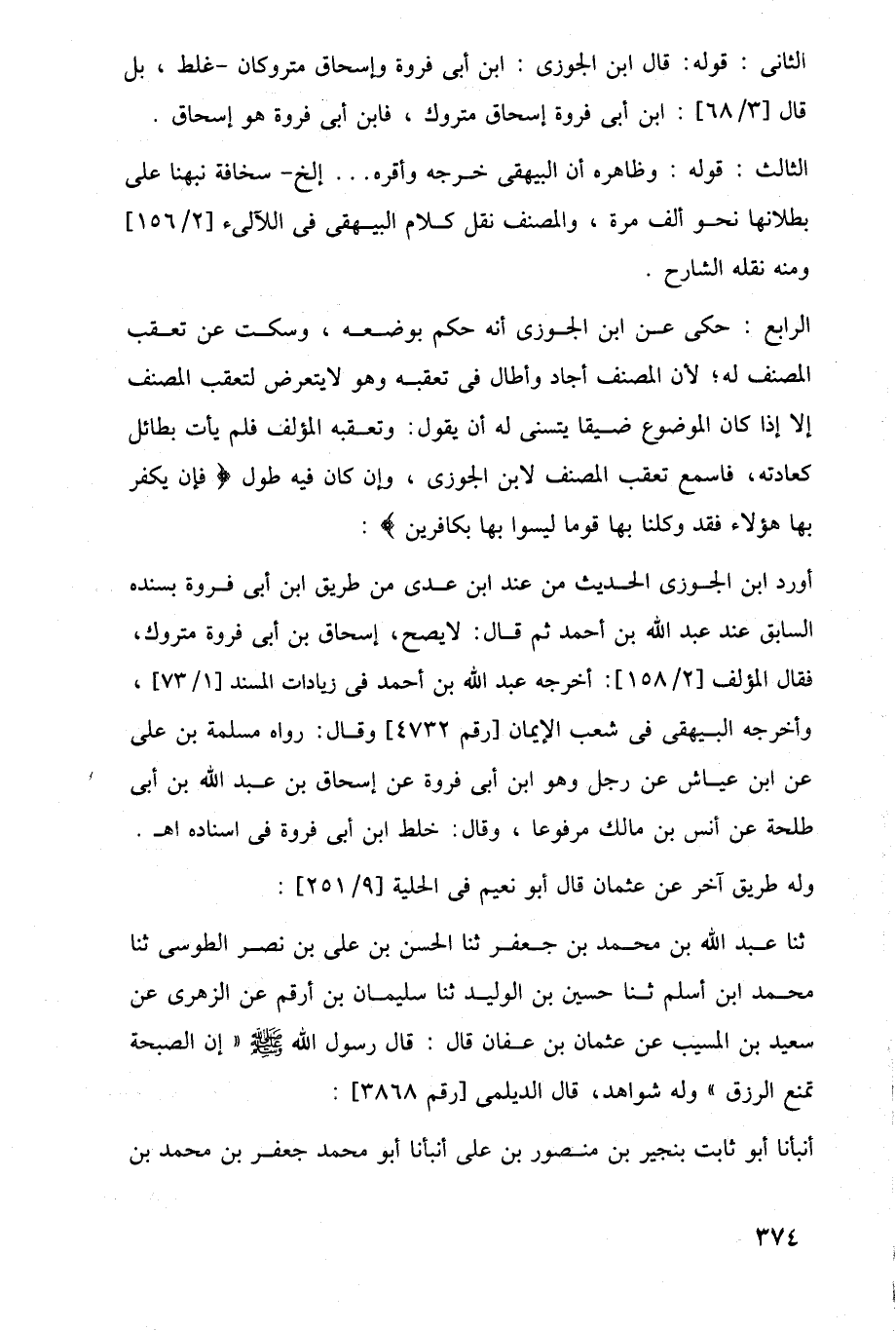 ثنا عبد اللَّه بن محمد بن جعفر ثنا الحسن بن على بن نصر الطوسى ثنا محمد ابن أسلم ثنا حسين بن الوليد ثنا سعليمان بن أرقم عن الزهرى عن سعيد بن المسيب عن عثمان بن عفان قال: قال رسول اللَّه -صلى اللَّه عليه وسلم- "إن الصبحة تمنع الرزق" وله شواهد، قال الديلمى [رقم 3868]: