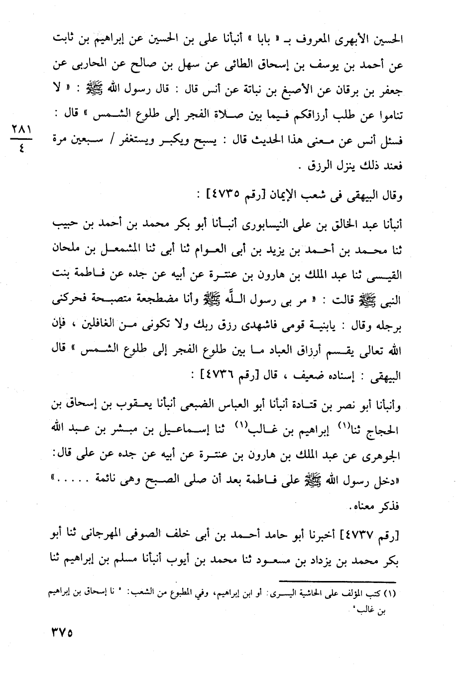 أنبأنا عبد الخالق بن على النيسابورى أنبأنا أبو بكر محمد بن أحمد بن حبيب ثنا محمد بن أحمد بن يزيد بن أبي العوام ثنا أبي ثنا المشمعل بن ملحان القيسى ثنا عبد الملك بن هارون بن عنترة عن أبيه عن جده عن فاطمة بنت النبي -صلى اللَّه عليه وسلم- قالت: "مر بى رسول اللَّه -صلى اللَّه عليه وسلم- وأنا مضطجعة متصبحة فحركنى برجله وقال: يا بنية قومى فاشهدى رزق ربك ولا تكونى من الغافلين، فإن اللَّه تعالى يقسم أرزاق العباد ما بين طلوع الفجر إلى طلوع الشمس" قال البيهقى: إسناده ضعيف، قال [رقم 4736]:
