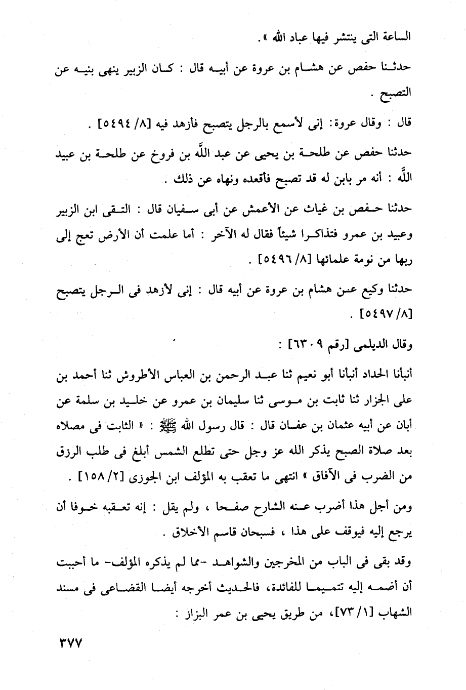 حدثنا حفص بن غياث عن الأعمش عن أبي سفيان قال: التقى ابن الزبير وعبيد بن عمرو فتذاكرا شيئًا فقال له الآخر: أما علمت أن الأرض تعج إلى ربها من نومة علمائها [8/ 5496].