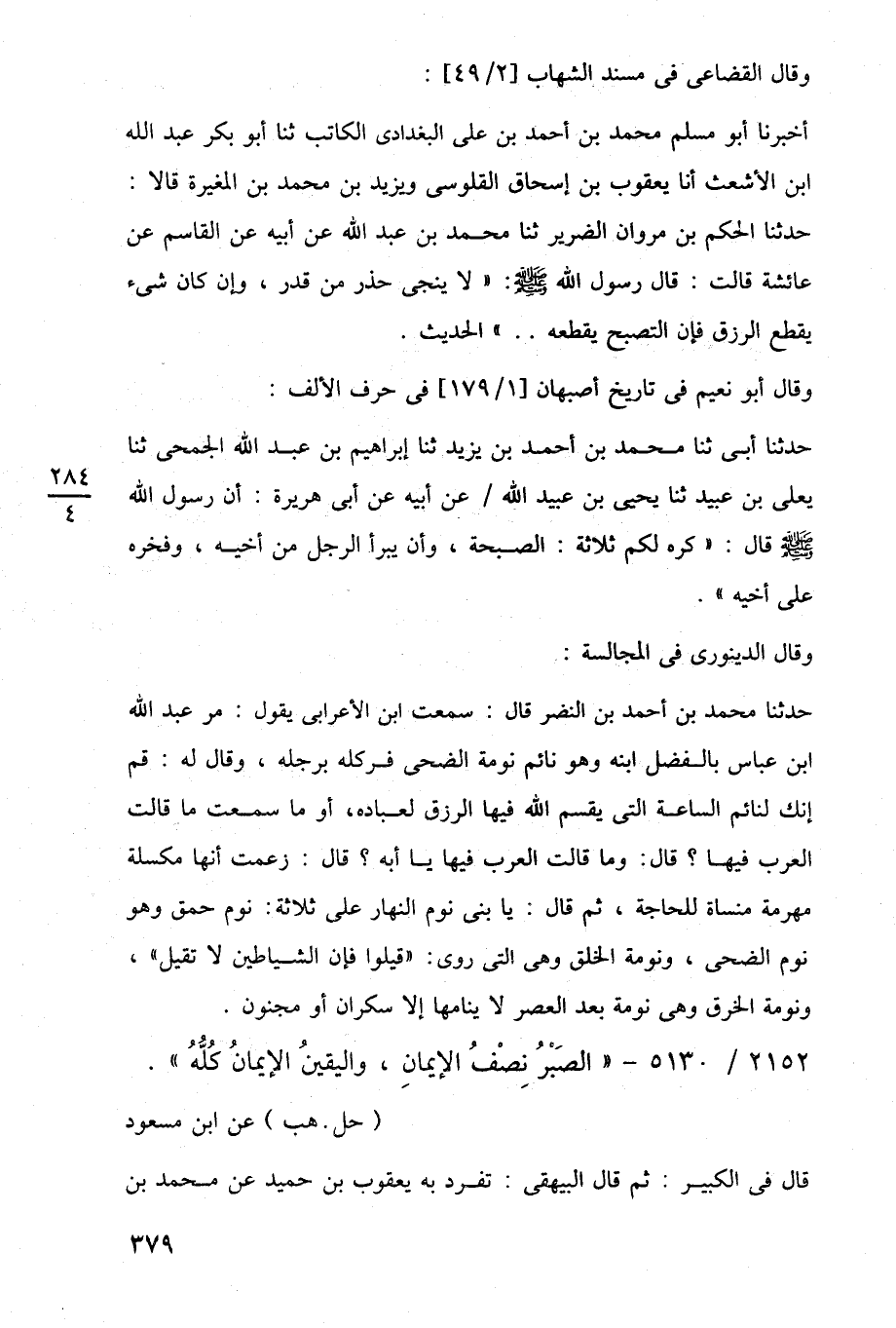 أخبرنا أبو مسلم محمد بن أحمد بن على البغدادى الكاتب ثنا أبو بكر عبد اللَّه ابن الأشعث أنا يعقوب بن إسحاق القلوسى ويزيد بن محمد بن المغيرة قالا: حدثنا الحكم بن مروان الضرير ثنا محمد بن عبد اللَّه عن أبيه عن القاسم عن عائشة قالت: قال رسول اللَّه -صلى اللَّه عليه وسلم-: "لا ينجى حذر من قدر، وإن كان شيء يقطع الرزق فإن التصبح يقطعه. . " الحديث.