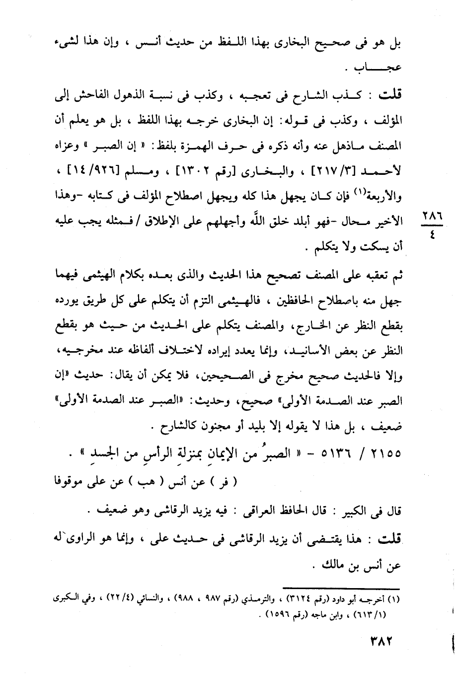 ثم تعقبه على المصنف تصحيح هذا الحديث والذي بعده بكلام الهيثمى فيهما جهل منه باصطلاح الحافظين، فالهيثمى التزم أن يتكلم على كل طريق يورده بقطع النظر عن الخارج، والمصنف يتكلم على الحديث من حيث هو بقطع النظر عن بعض الأسانيد، وإنما يعدد إيراده لاختلاف ألفاظه عند مخرجيه، وإلا فالحديث صحيح مخرج في الصحيحين، فلا يمكن أن يقال: حديث "إن الصبر عند الصدمة الأولى" صحيح، وحديث: "الصبر عند الصدمة الأولى" ضعيف، بل هذا لا يقوله إلا بليد أو مجنون كالشارح.