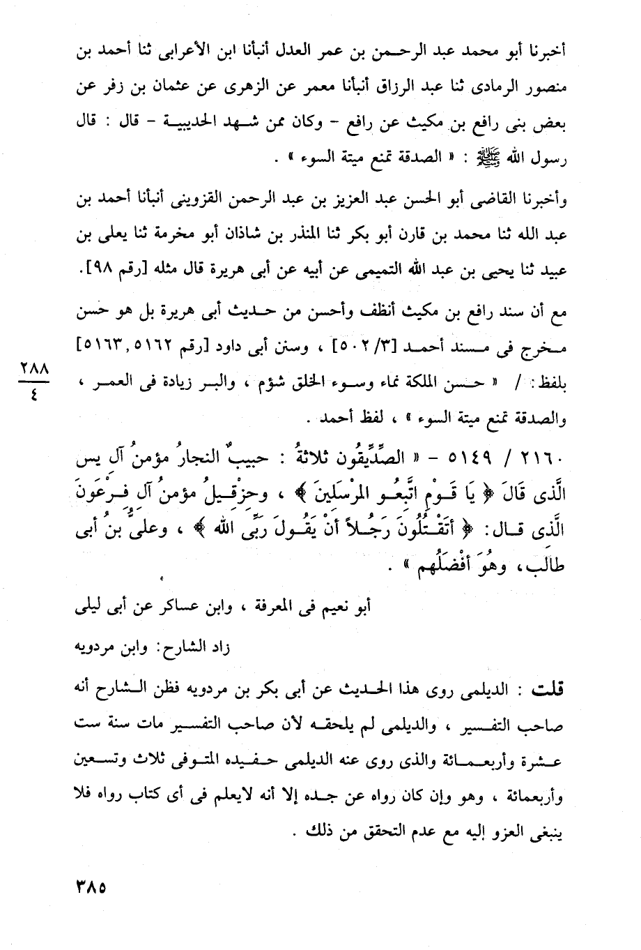 أخبرنا أبو محمد عبد الرحمن بن عمر العدل أنبأنا ابن الأعرابى ثنا أحمد بن منصور الرمادى ثنا عبد الرزاق أنبأنا معمر عن الزهرى عن عثمان بن زفر عن بعض بنى رافع بن مكيث عن رافع -وكان ممن شهد الحديبية- قال: قال رسول اللَّه -صلى اللَّه عليه وسلم-: "الصدقة تمنع ميتة السوء".
