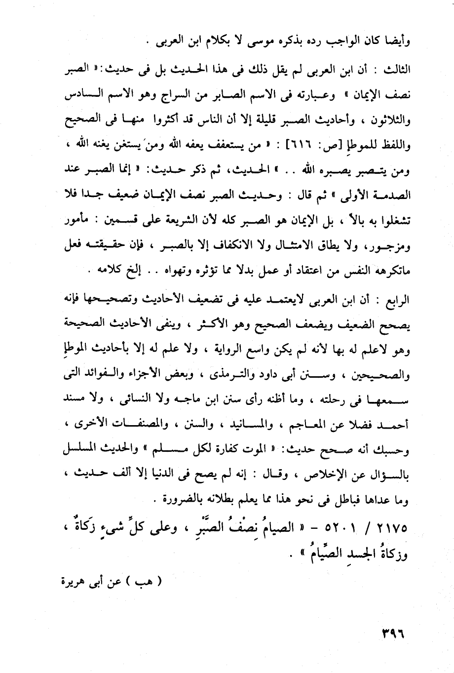 الثالث: أن ابن العربى لم يقل ذلك في هذا الحديث بل في حديث: "الصبر نصف الإيمان" وعبارته في الاسم الصابر من السراج وهو الاسم السادس والثلاثون، وأحاديث الصبر قليلة إلا أن الناس قد أكثروا منها في الصحيح واللفظ للموطإِ [ص: 616]: "من يستعفف يعفه اللَّه ومن يستغن يغنه اللَّه، ومن يتصبر يصبره اللَّه. . " الحديث، ثم ذكر حديث: "إنما الصبر عند الصدمة الأولى" ثم قال: وحديث الصبر نصف الإيمان ضعيف جدا فلا تشغلوا به بالًا، بل الإيمان هو الصبر كله لأن الشريعة على قسمين: مأمور ومزجور، ولا يطاق الامتثال ولا الانكفاف إلا بالصبر، فإن حقيقته فعل ما تكرهه النفس من اعتقاد أو عمل بدلا مما تؤثره وتهواه. . إلخ كلامه.