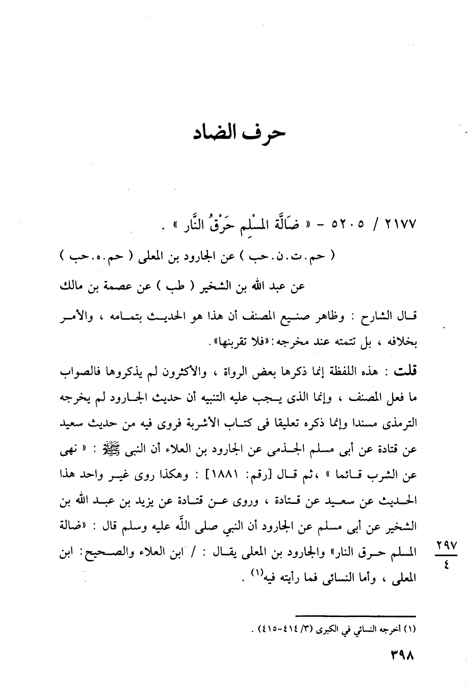 قلت: هذه اللفظة إنما ذكرها بعض الرواة، والأكثرون لم يذكروها فالصواب ما فعل المصنف، وإنما الذي يجب عليه التشيه أن حديث الجارود لم يخرجه الترمذى مسندا وإنما ذكره تعليقا في كتاب الأشربة فروى فيه من حديث سعيد عن قتادة عن أبي مسلم الجذمى عن الجارود بن العلاء أن النبي -صلى اللَّه عليه وسلم-: "نهى عن الشرب قائما"، ثم قال [رقم: 1881]: وهكذا روى غير واحد هذا الحديث عن سعيد عن قتادة، وروى عن قتادة عن يزيد بن عبد اللَّه بن الشخير عن أبي مسلم عن الجارود أن النبي صلى اللَّه عليه وسلم قال: "ضالة المسلم حرق النار" والجارود بن المعلى يقال: ابن العلاء والصحيح: ابن المعلى، وأما النسائى فما رأيته فيه (¬1).