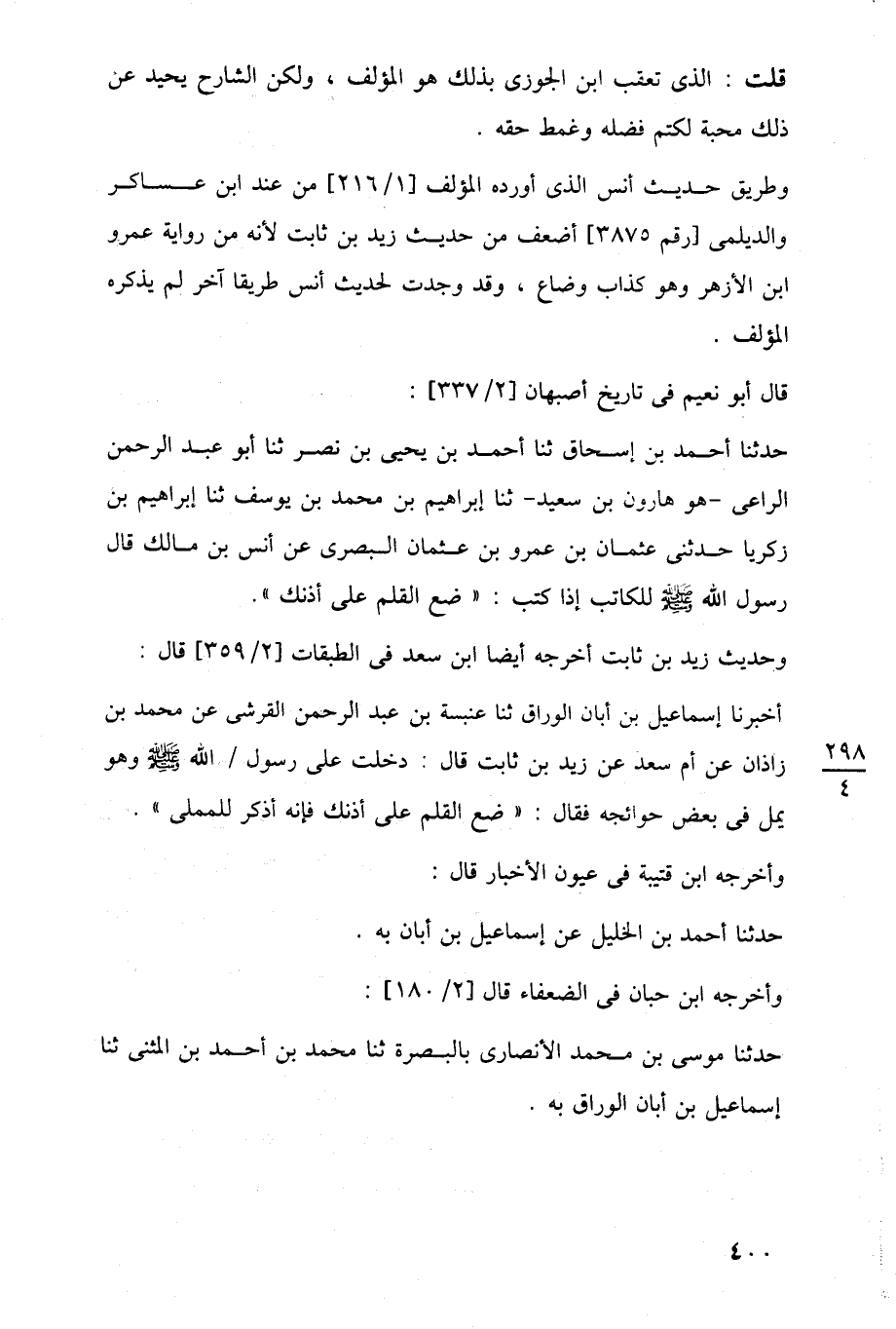 حدثنا أحمد بن إسحاق ثنا أحمد بن يحيى بن نصر ثنا أبو عبد الرحمن الراعى -هو هارون بن سعيد- ثنا إبراهيم بن محمد بن يوسف ثنا إبراهم بن زكريا حدثنى عثمان بن عمرو بن عثمان البصرى عن أنس بن مالك قال رسول اللَّه -صلى اللَّه عليه وسلم- للكاتب إذا كتب: "ضع القلم على أذنك".
