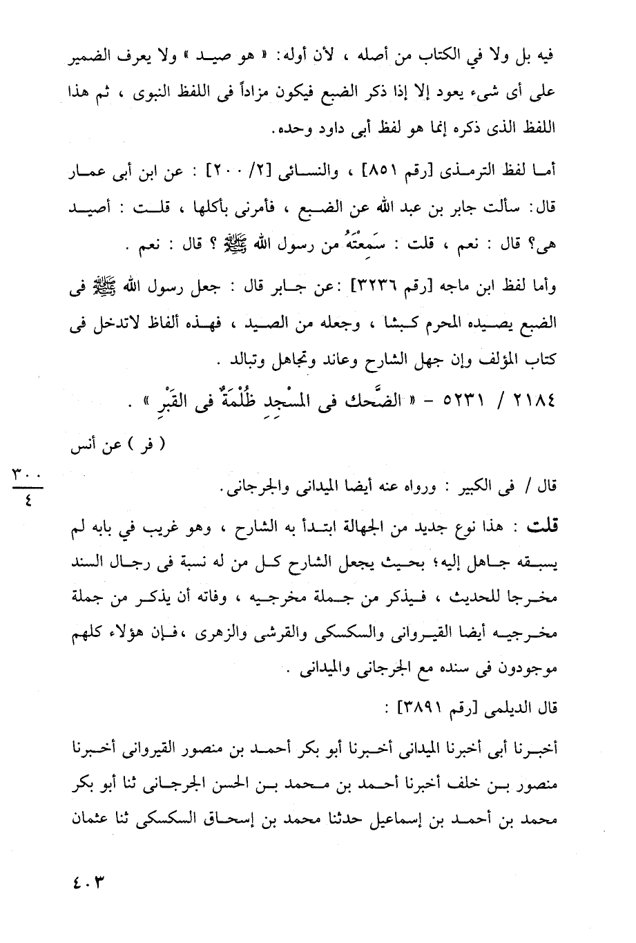 أما لفظ الترمذى [رقم 851]، والنسائى [2/ 200]: عن ابن أبي عمار قال: سألت جابر بن عبد اللَّه عن الضبع، فأمرنى بأكلها، قلت: أصيد هي؟ قال: نعم، قلت: سَمِعْتَهُ من رسول اللَّه -صلى اللَّه عليه وسلم-؟ قال: نعم.
