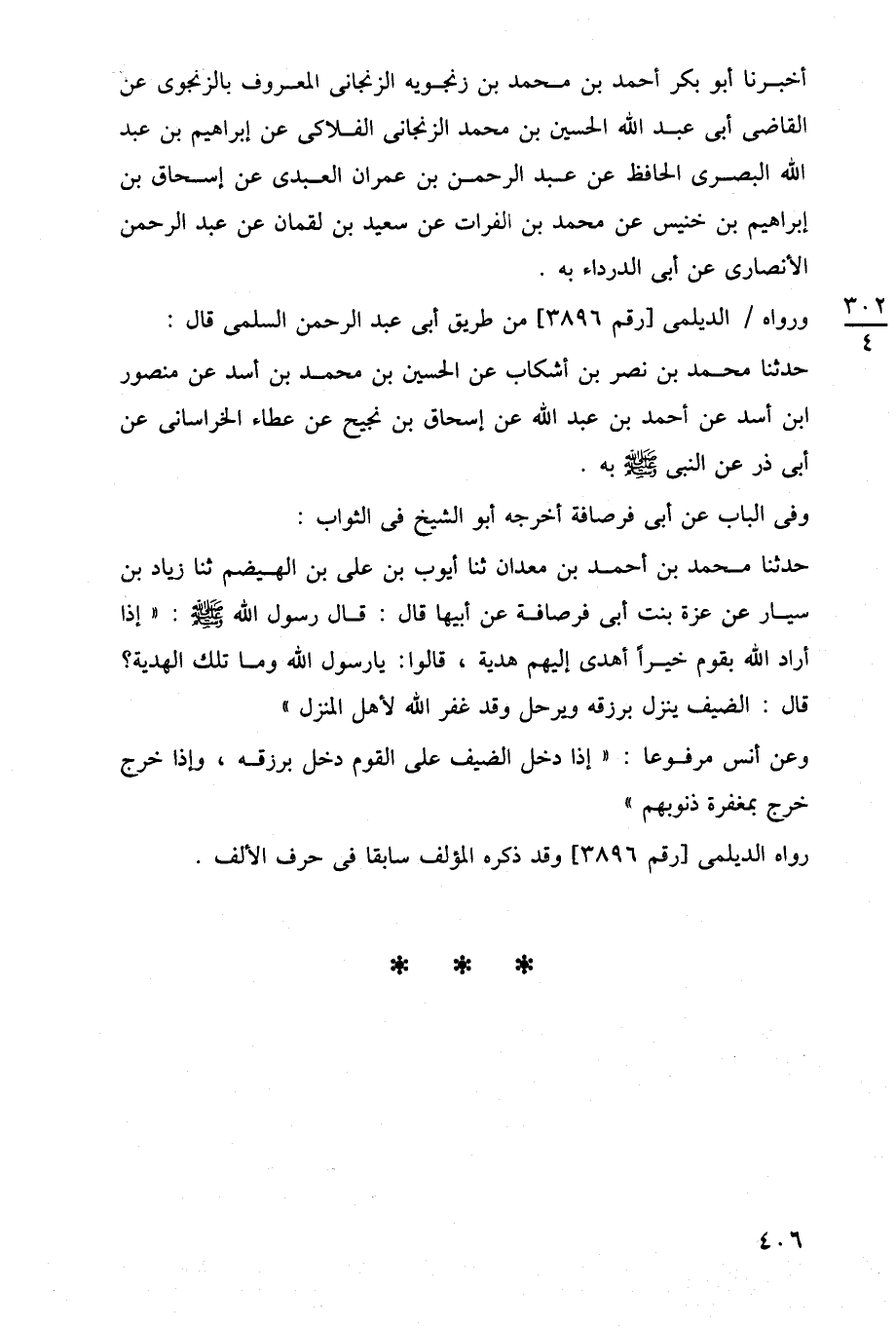 أخبرنا أبو بكر أحمد بن محمد بن زنجويه الزنجانى المعروف بالزنجوى عن القاضى أبي عبد اللَّه الحسين بن محمد الزنجانى الفلاكى عن إبراهيم بن عبد اللَّه البصرى الحافظ عن عبد الرحمن بن عمران العبدى عن إسحاق بن إبراهيم بن خنيس عن محمد بن الفرات عن سعيد بن لقمان عن عبد الرحمن الأنصارى عن أبي الدرداء به.