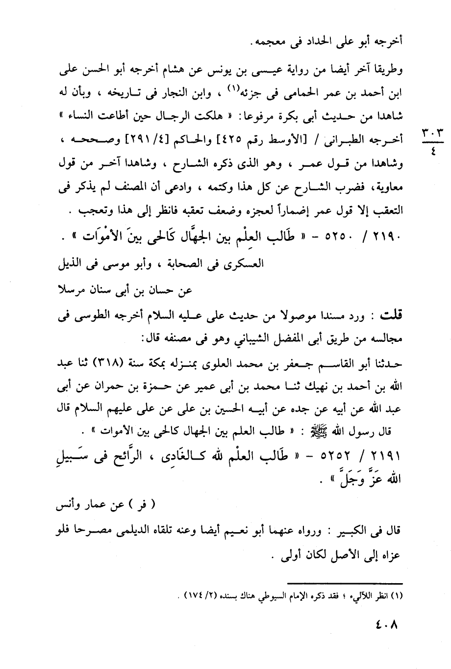 حدثنا أبو القاسم جعفر بن محمد العلوي بمنزله بمكة سنة (318) ثنا عبد اللَّه بن أحمد بن نهيك ثنا محمد بن أبي عمير عن حمزة بن حمران عن أبي عبد اللَّه عن أبيه عن جده عن أبيه الحسين بن على عن على عليهم السلام قال قال رسول اللَّه -صلى اللَّه عليه وسلم-: "طالب العلم بين الجهال كالحي بين الأموات".