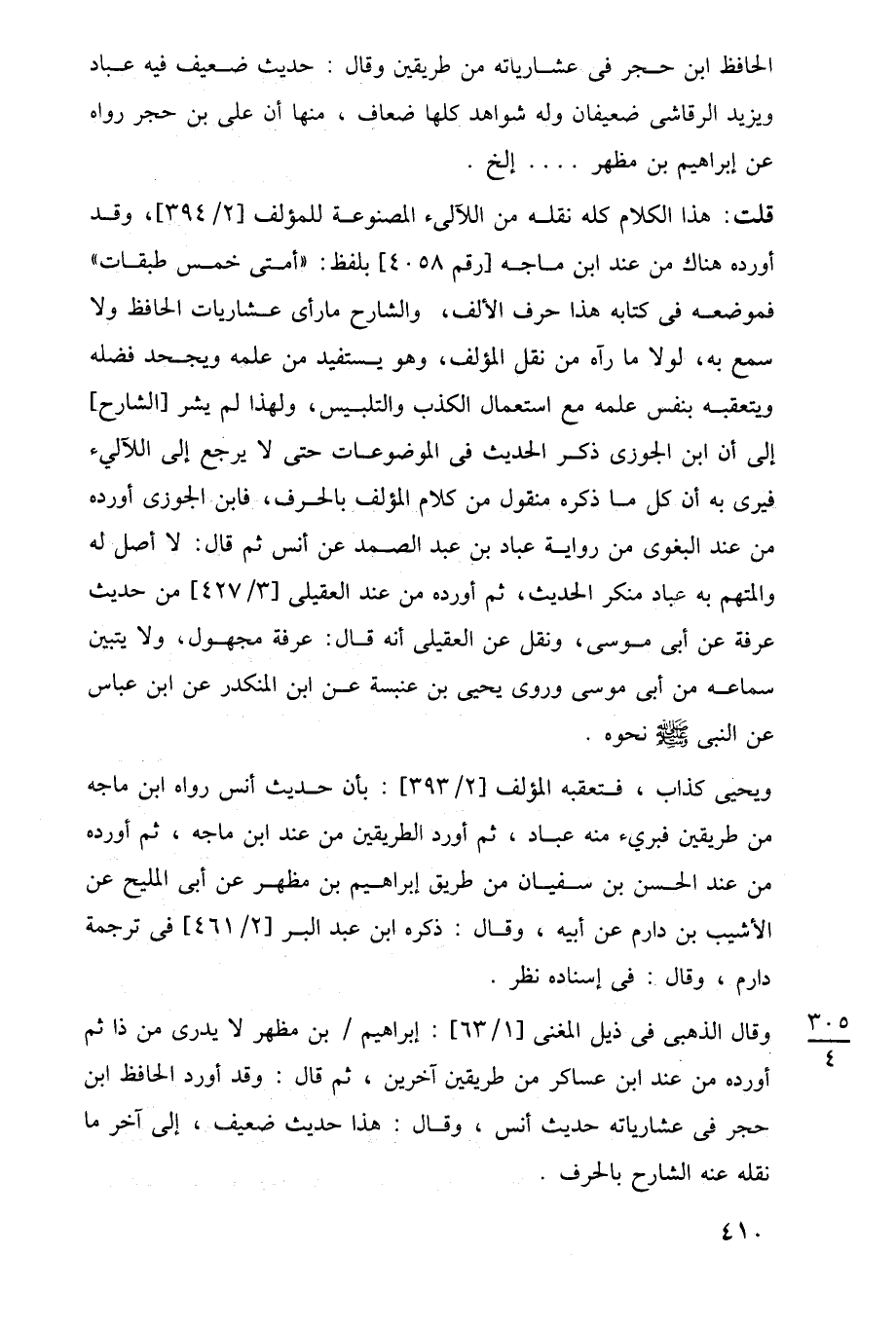 قلت: هذا الكلام كله نقله من اللآلئ المصنوعة للمؤلف [2/ 394]، وقد أورده هناك من عند ابن ماجه [رقم 4058] بلفظ: "أمتى خمس طبقات" فموضعه في كتابه هذا حرف الألف، والشارح ما رأى عشاريات الحافظ ولا سمع به، لولا ما رآه من نقل المؤلف، وهو يستفيد من علمه ويجحد فضله ويتعقبه بنفس علمه مع استعمال الكذب والتلبيس، ولهذا لم يشر [الشارح] إلى أن ابن الجوزى ذكر الحديث في الموضوعات حتى لا يرجع إلى اللآلئ فيرى به أن كل ما ذكره منقول من كلام المؤلف بالحرف، فابن الجوزى أورده من عند البغوى من رواية عباد بن عبد الصمد عن أنس ثم قال: لا أصل له والمتهم به عباد منكر الحديث، ثم أورده من عند العقيلى [3/ 427] من حديث عرفة عن أبي موسى، ونقل عن العقيلى أنه قال: عرفة مجهول، ولا يتبين سماعه من أبي موسى وروى يحيى بن عنبسة عن ابن المنكدر عن ابن عباس عن النبي -صلى اللَّه عليه وسلم- نحوه.