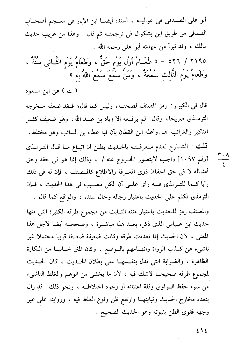 قلت: الشارح لعدم معرفته بالحديث يظن أن اتباع ما قال الترمذى [رقم 1097] واجب لا يتصور الخروج عنه، وذلك إنما هو في حقه وحق أمثاله لا في حق الحفاظ ذوى المعرفة والاطلاع كالمصنف، فإن له في ذلك رأيا كما للترمذى فيه رأى على أن الكل مصيب في هذا الحديث، فان الترمذى تكلم على الحديث باعتبار رجاله وحال سنده، والواقع كما قال.