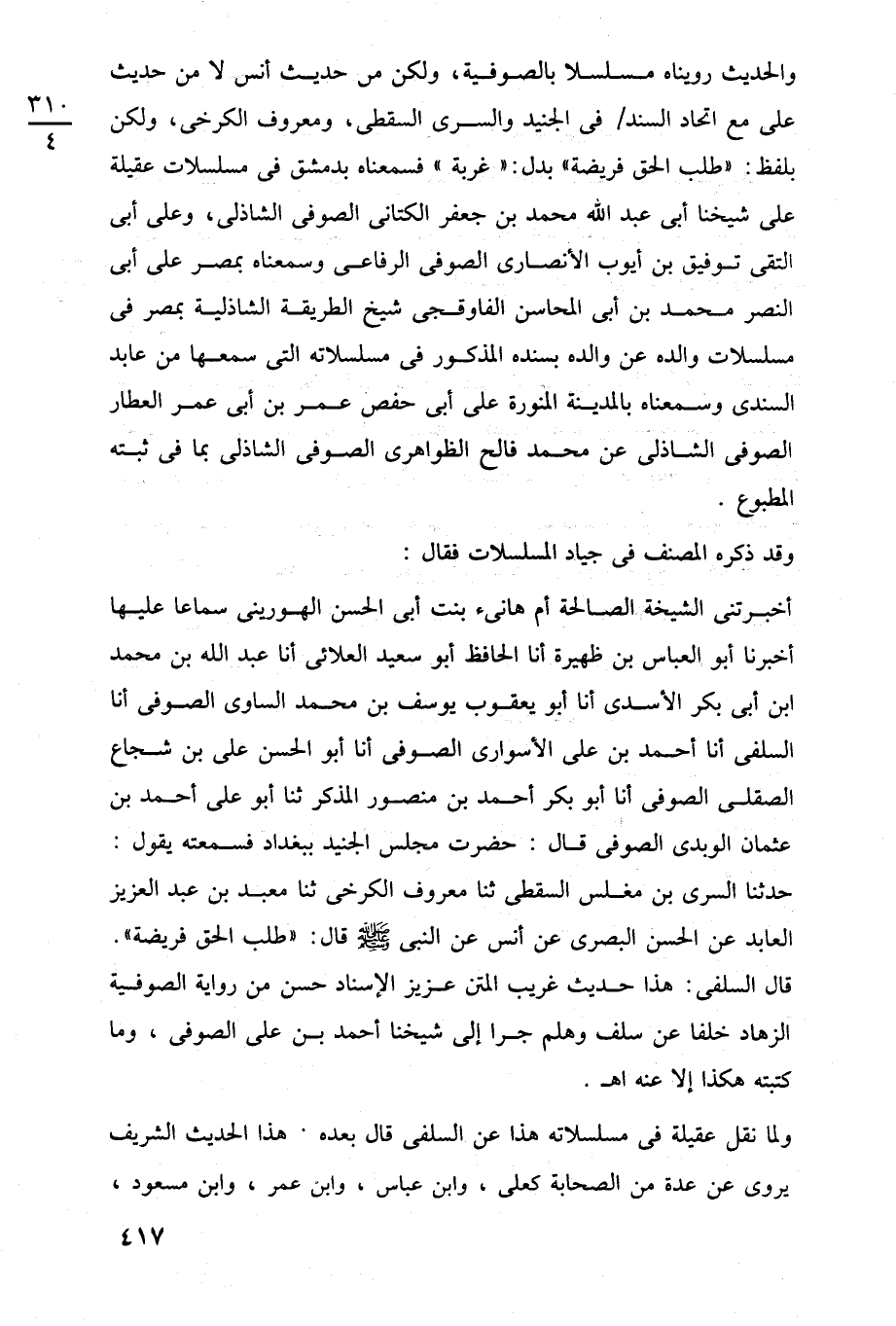 أخبرتنى الشيخة الصالحة أم هانئ بنت أبي الحسن الهورينى سماعا عليها أخبرنا أبو العباس بن ظهيرة أنا الحافظ أبو سعيد العلائى أنا عبد اللَّه بن محمد ابن أبي بكر الأسدى أنا أبو يعقوب يوسف بن محمد الساوى الصوفى أنا السلفى أنا أحمد بن على الأسوارى الصوفى أنا أبو الحسن على بن شجاع الصقلى الصوفى أنا أبو بكر أحمد بن منصور المذكر ثنا أبو على أحمد بن عثمان الوبدى الصوفى قال: حضرت مجلس الجنيد ببغداد فسمعته يقول: حدثنا السري بن مغلس السقطى ثنا معروف الكرخى ثنا معبد بن عبد العزيز العابد عن الحسن البصرى عن أنس عن النبي -صلى اللَّه عليه وسلم- قال: "طلب الحق فريضة". قال السلفى: هذا حديث غريب المتن عزيز الإسناد حسن من رواية الصوفية الزهاد خلفا عن سلف وهلم جرا إلى شيخنا أحمد بن على الصوفى، وما كتبته هكذا إلا عنه اهـ.