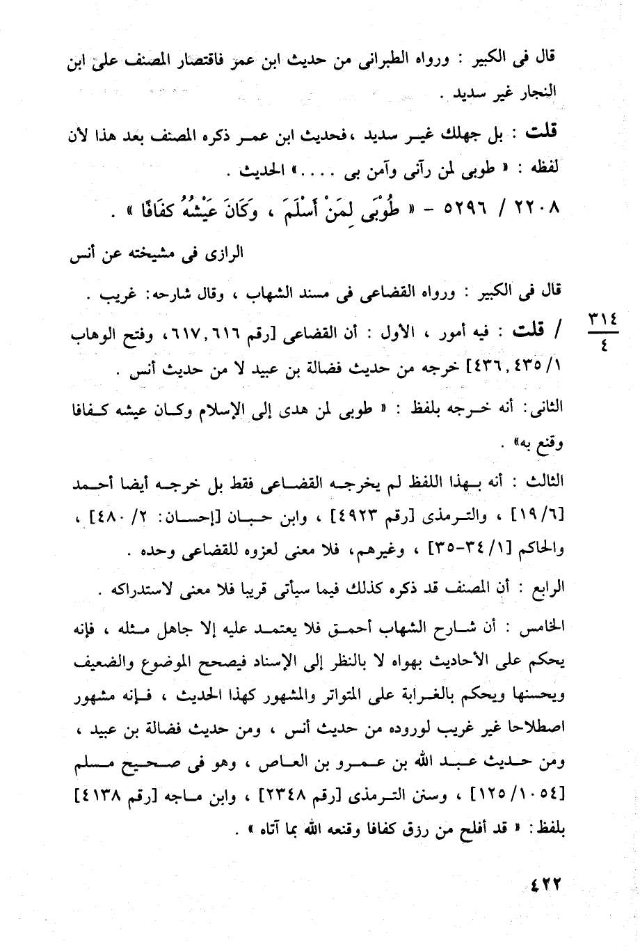 الخامس: أن شارح الشهاب أحمق فلا يعتمد عليه إلا جاهل مثله، فإنه يحكم على الأحاديث بهواه لا بالنظر إلى الإسناد فيصحح الموضوع والضعيف ويحسنها ويحكم بالغرابة على المتواتر والمشهور كهذا الحديث، فإنه مشهور اصطلاحا غير غريب لوروده من حديث أنس، ومن حديث فضالة بن عبيد، ومن حديث عبد اللَّه بن عمرو بن العاص، وهو في صحيح مسلم [1054/ 125]، وسنن الترمذى [رقم 2348]، وابن ماجه [رقم 4138] بلفظ: "قد أفلح من رزق كفافا وقنعه اللَّه بما آتاه".