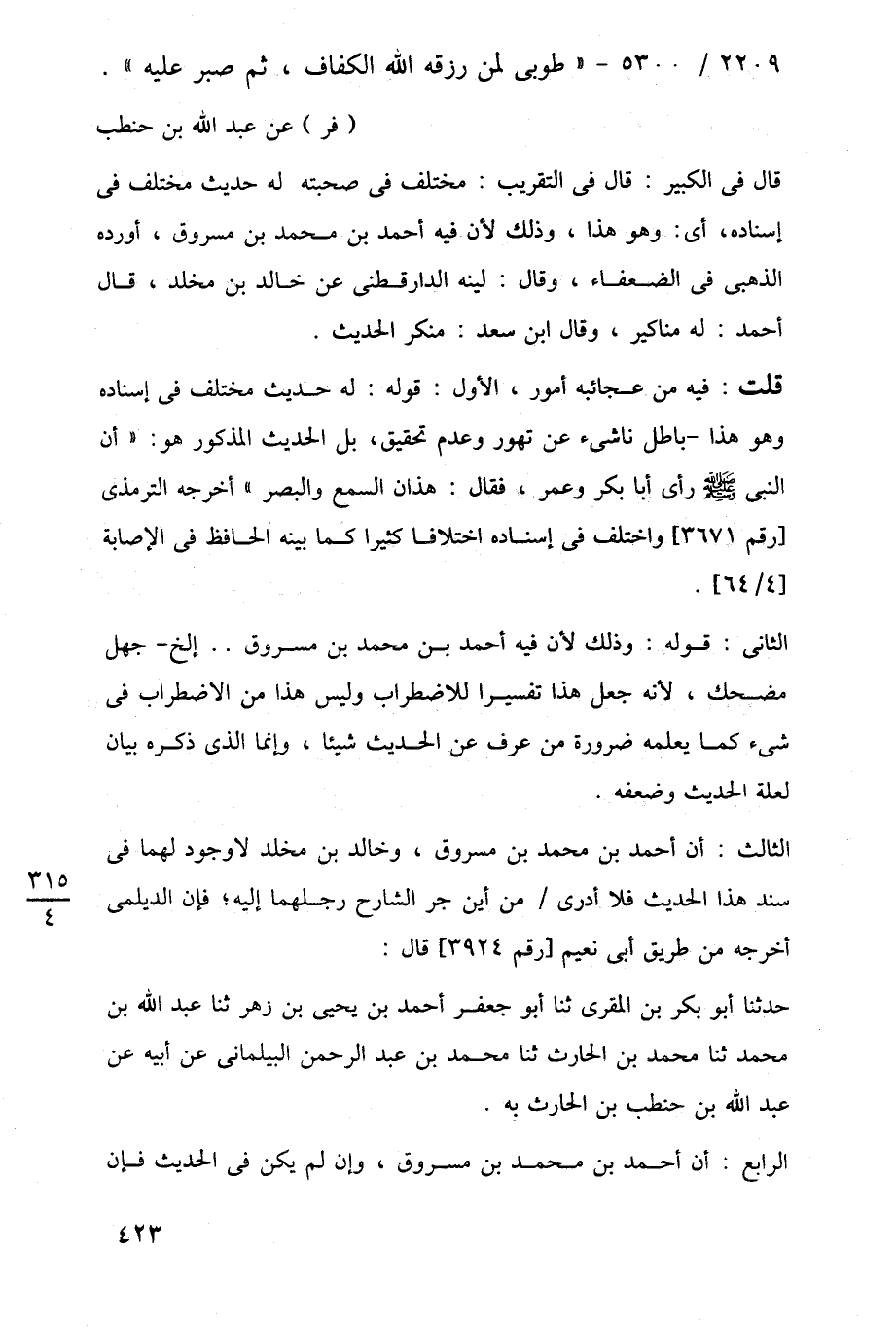 قال في الكبير: قال في التقريب: مختلف في صحبته له حديث مختلف في إسناده، أى: وهو هذا، وذلك لأن فيه أحمد بن محمد بن مسروق، أورده الذهبى في الضعفاء، وقال: لينه الدارقطنى عن خالد بن مخلد، قال أحمد: له مناكير، وقال ابن سعد: منكر الحديث.