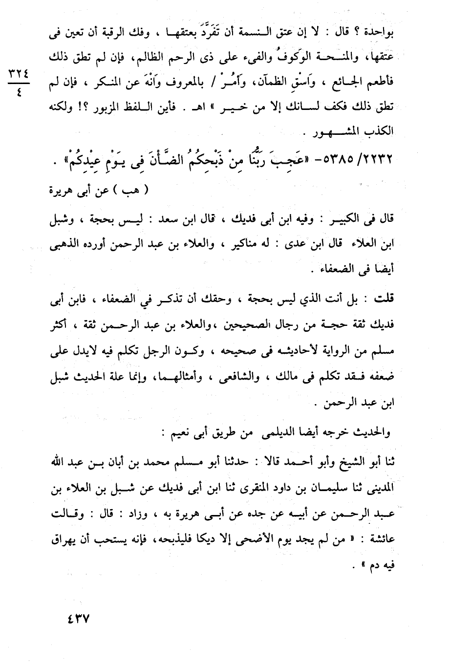 قلت: بل أنت الذي ليس بحجة، وحقك أن تذكر في الضعفاء، فابن أبي فديك ثقة حجة من رجال الصحيحين، والعلاء بن عبد الرحمن ثقة، أكثر مسلم من الرواية لأحاديثه في صحيحه، وكون الرجل تكلم فيه لا يدل على ضعفه فقد تكلم في مالك، والشافعى، وأمثالهما، وإنما علة الحديث شبل ابن عبد الرحمن.